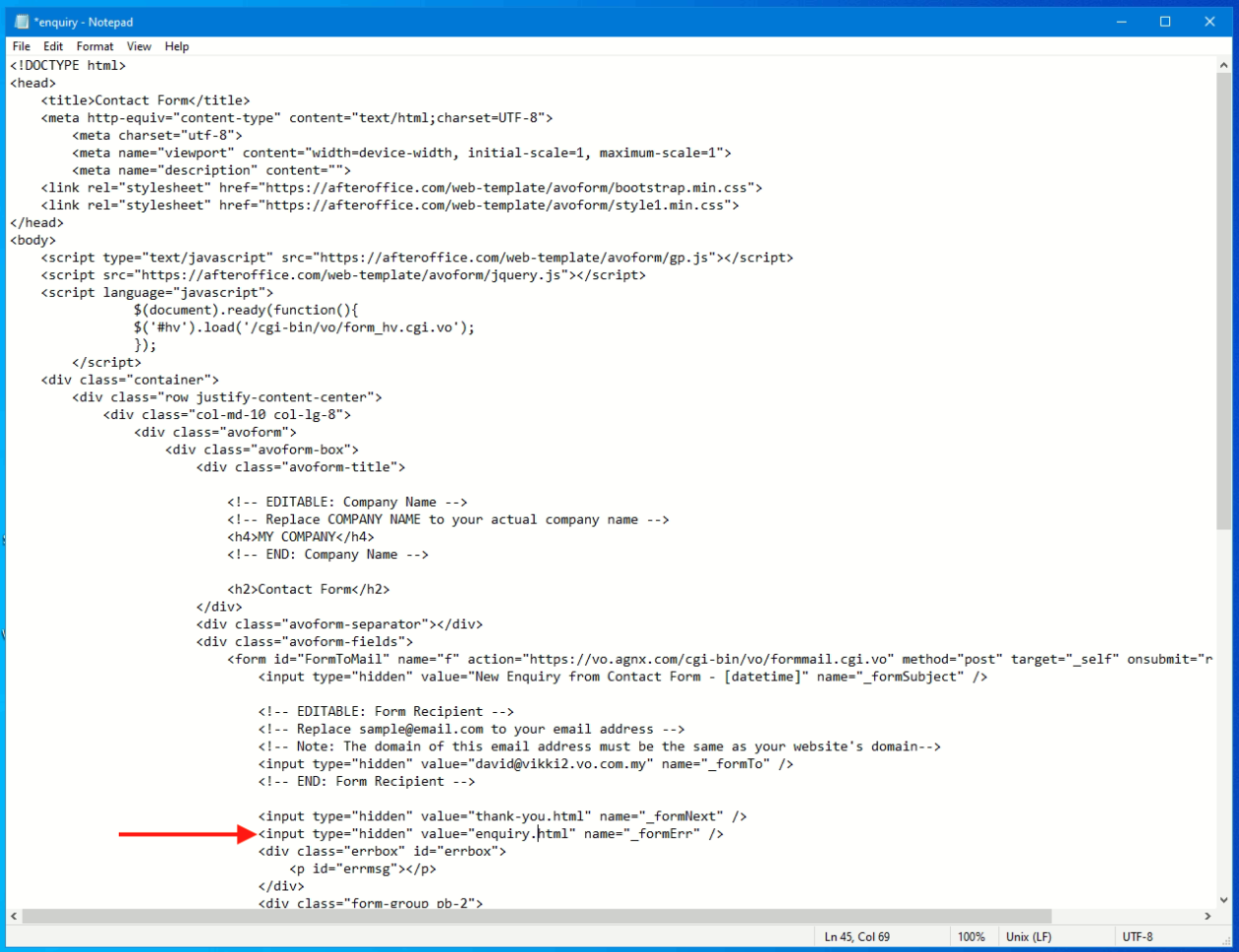 Next, we will modify the recipient email address. This recipient email address will be the one who receives all the form submissions. Look for: <!– EDITABLE: Form Recipient –> and you will see <input type=“hidden” value=“sample@email.com” name=“_formTo” /> after a few lines.