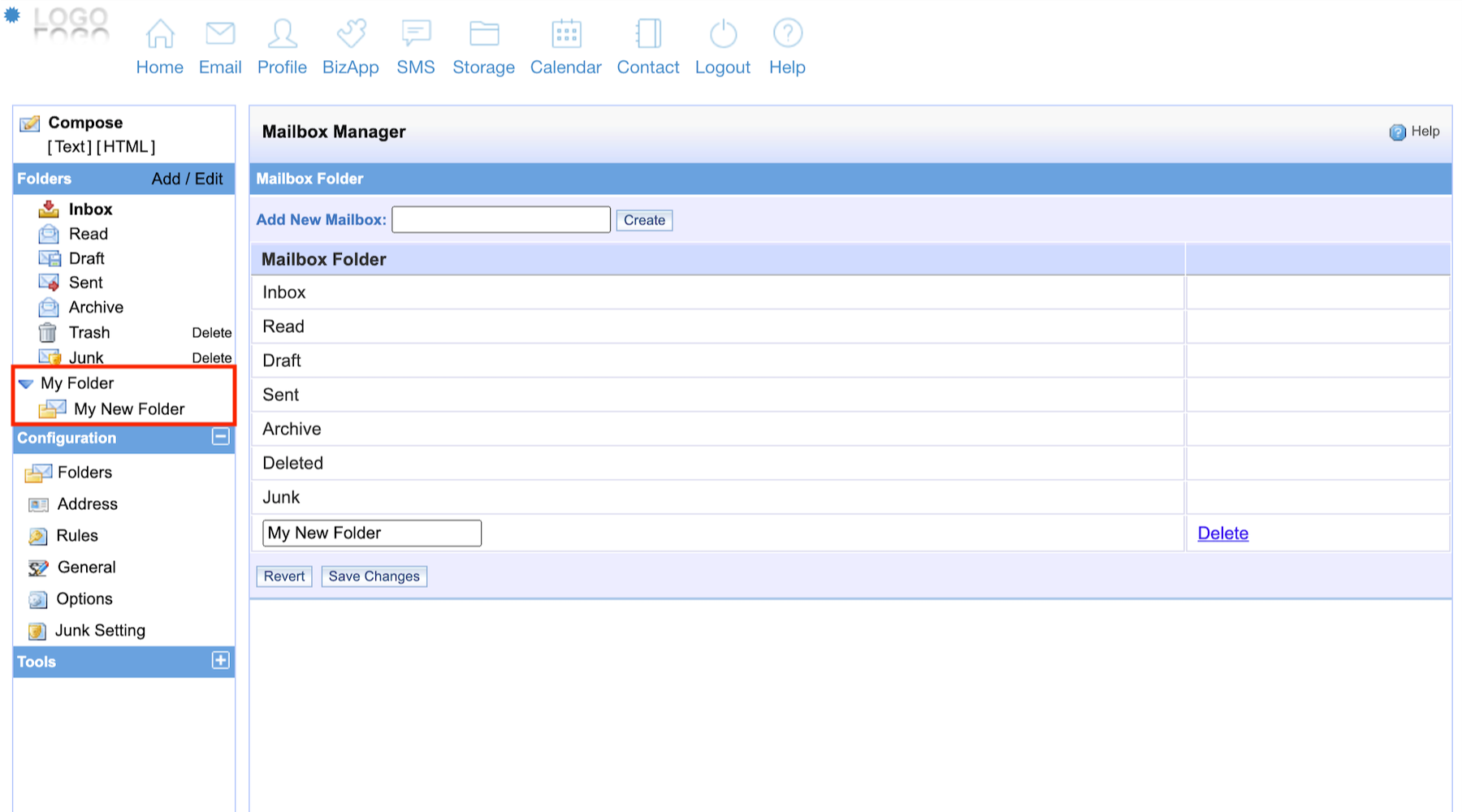 2. On Add New Mailbox, key in the folder name of your choice and click Create.