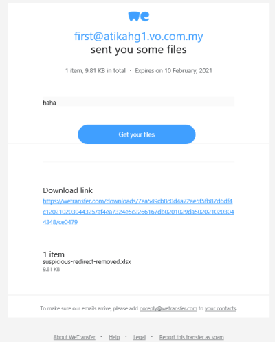 WeTransfer is one of famous cloud-based online platform for file transferring. As famous as it is, there are numerous ‘phishers’ who would take this opportunity to fake the email which looks similar to WeTransfer email. The fake email is used to steal your login details and even can install dangerous malwares on your devices.