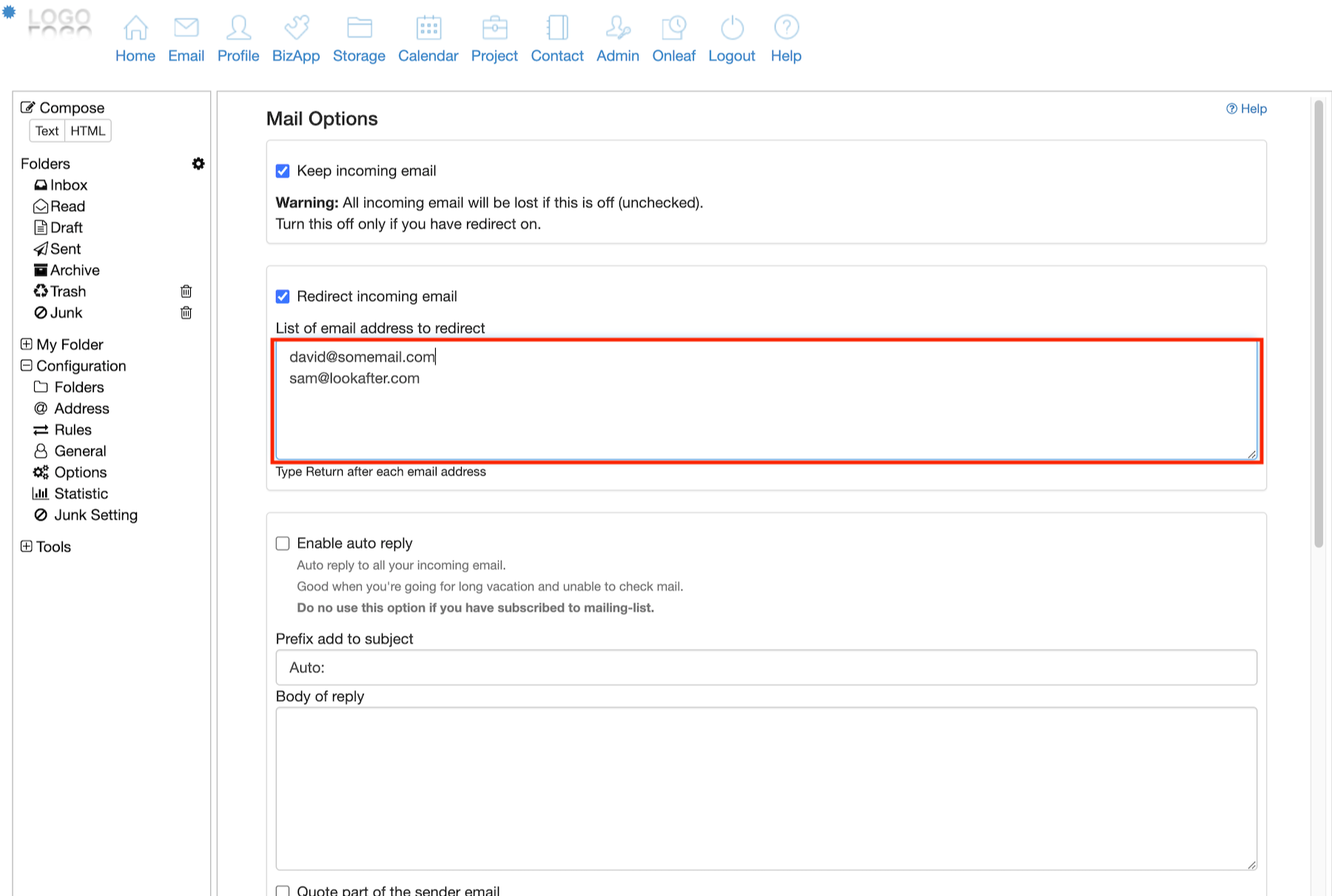 4. In the text box below, type the email address that you want your new incoming emails to be forwarded to. Separate multiple email addresses by entering one line down (return).