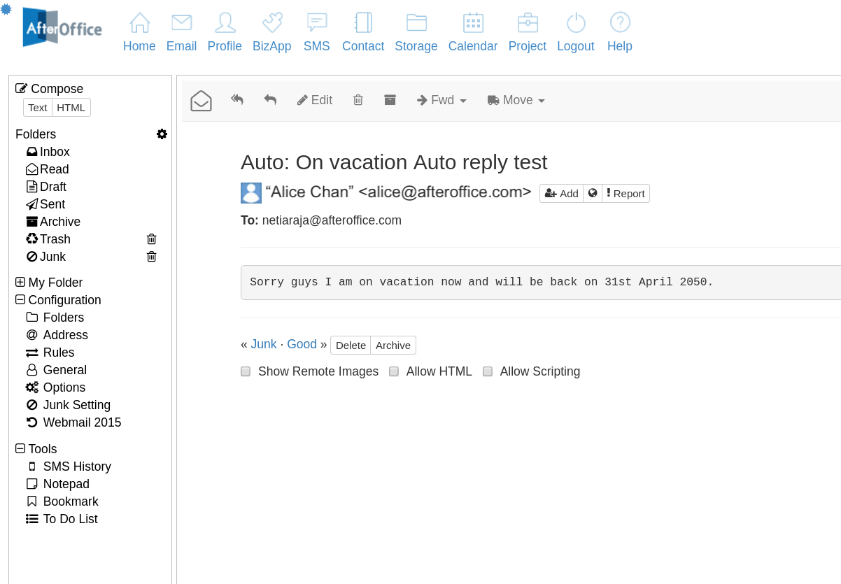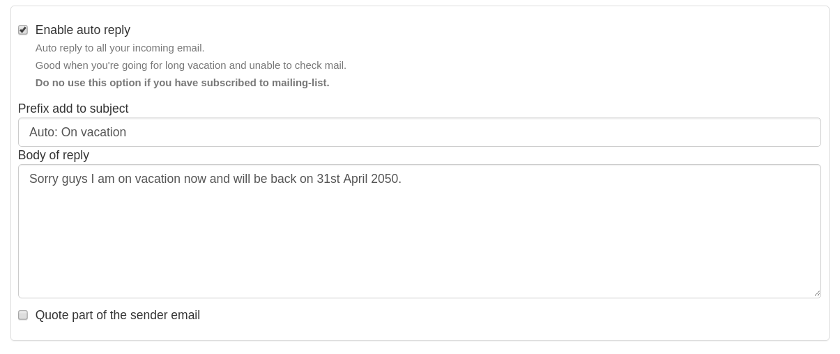 Now that you have enabled the auto-reply feature, when someone sends an email to you, he will receive the auto-reply message as configured above.