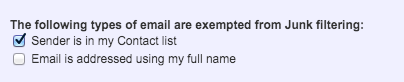[Sender is in user's Contact list], so that email that is recorded in your Address Book will be exempted from junk filtering.