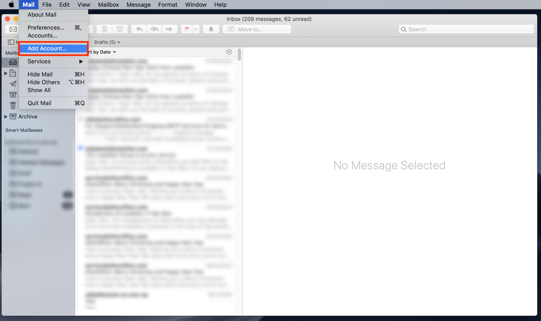 1. Open the Apple Mac Mail. Then, go to Mail and click on Add Account….