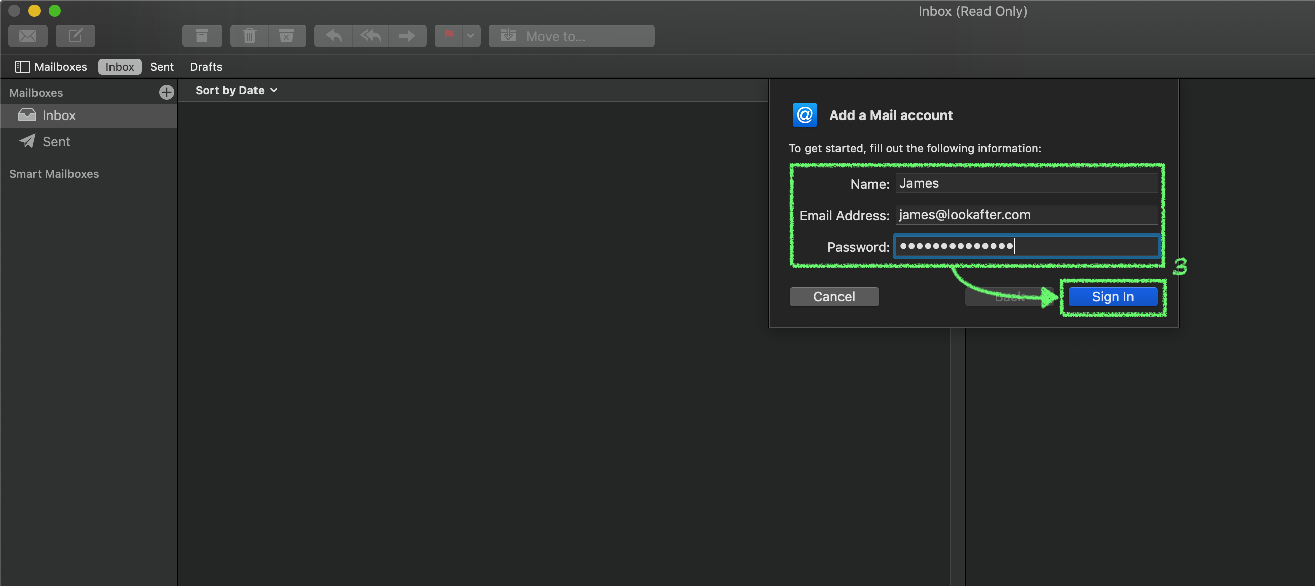 3. On “Add a Mail account”, enter your name, email address and password, and click Sign In.