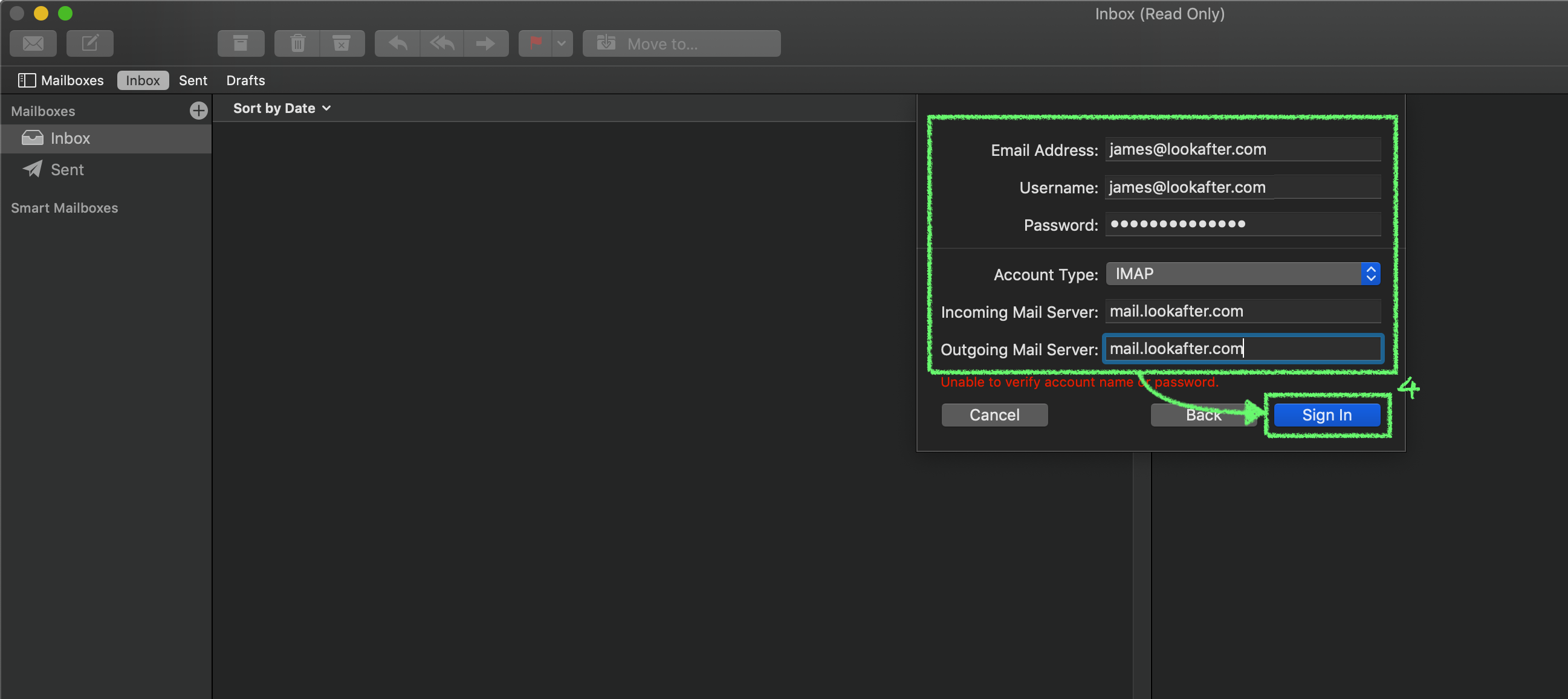 To setup an IMAP email account on your Mac Mail, please follow the steps below. We are using james@lookafter.com as an example in this guide.
