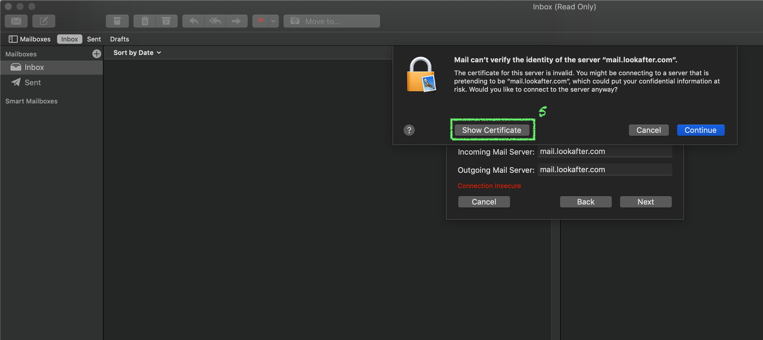 5. You will see the following warning displayed. Click Show Certificate to view the mail server certificate.