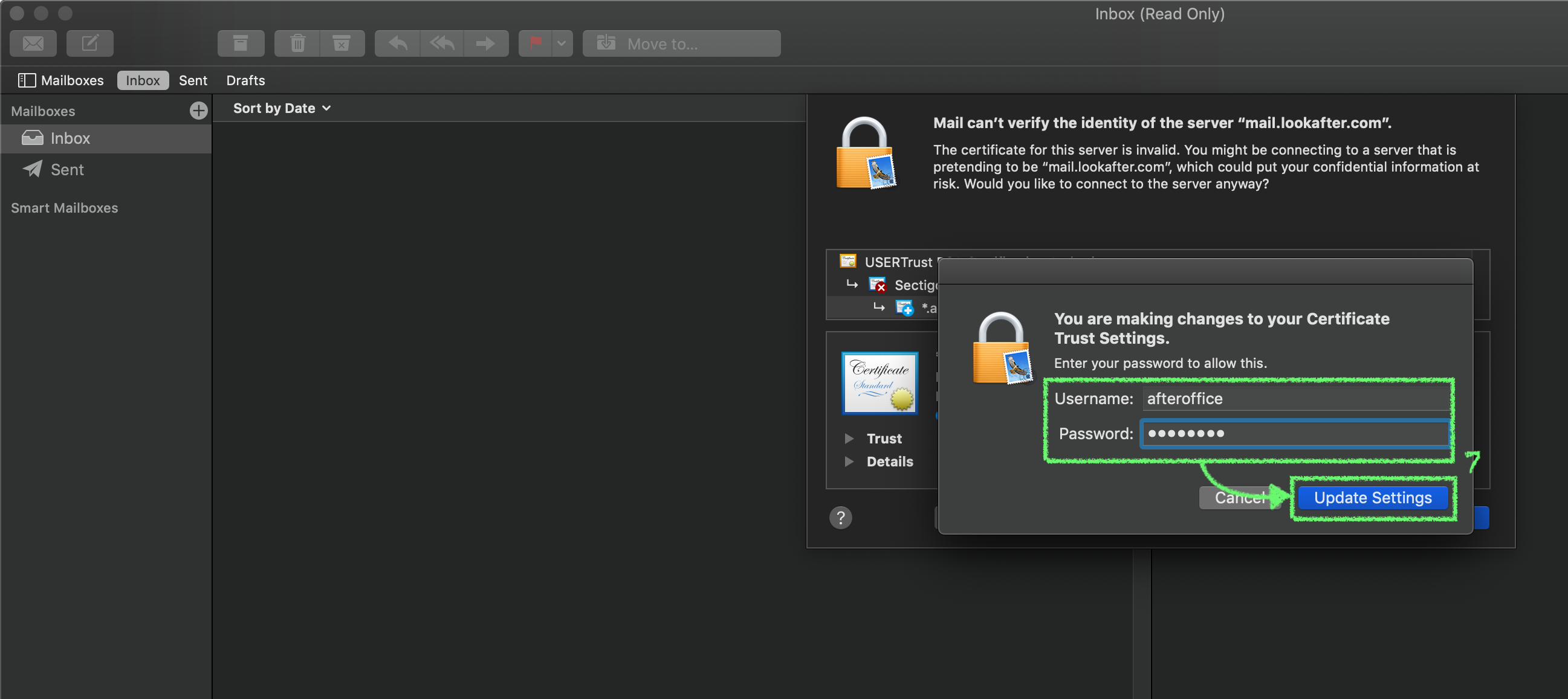 7. To trust and save the certificate, you are required to key in your machine's username and password, and click Update Settings.