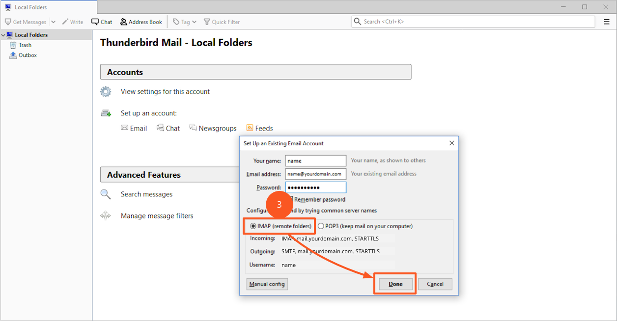 3. Thunderbird will automatically configure your mail settings. Once the configuration is done, make sure that “IMAP (remote folders)” option is selected, and click [Done] to create the Thunderbird account.