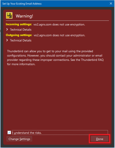 This warning will be prompted when you select None for SSL. So, you can tick I understand the risks checkbox. Then, click on [Done].