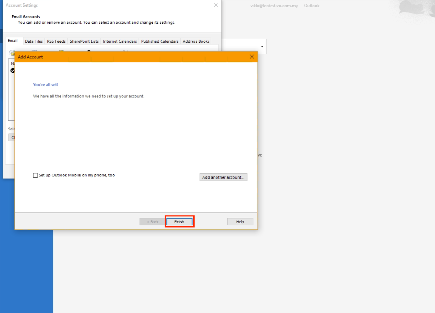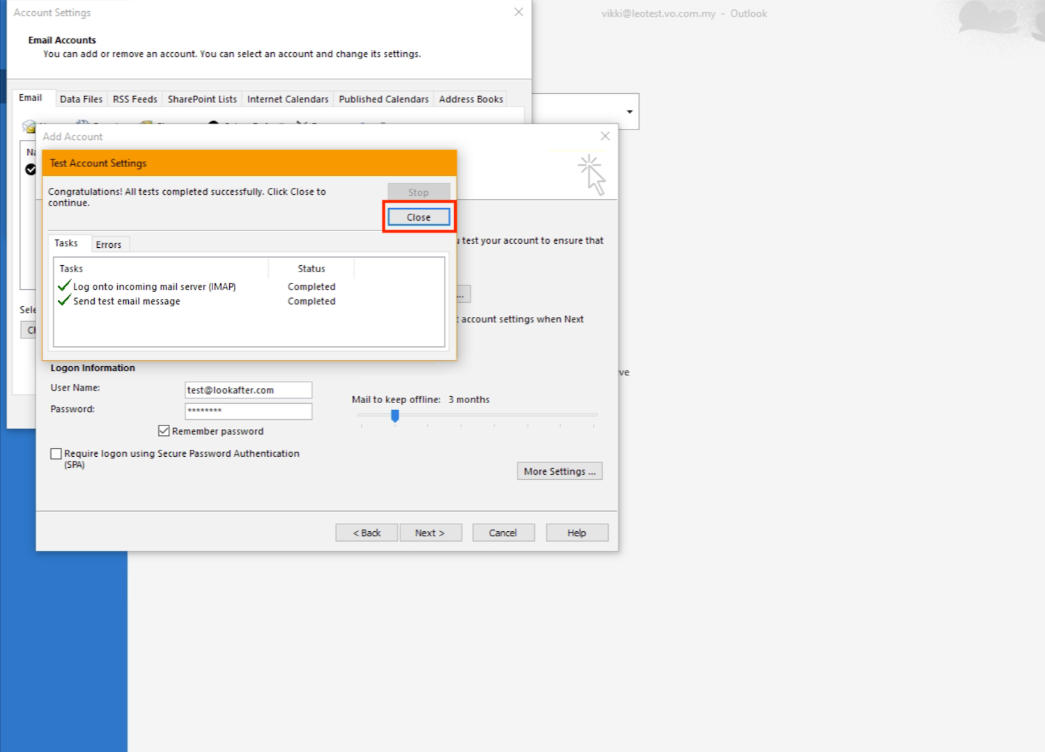 12. Ms Outlook will test on the incoming and outgoing connections. Once it is done, click Close.