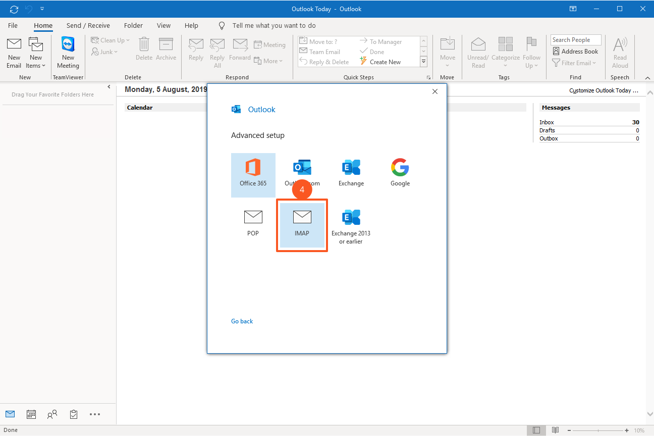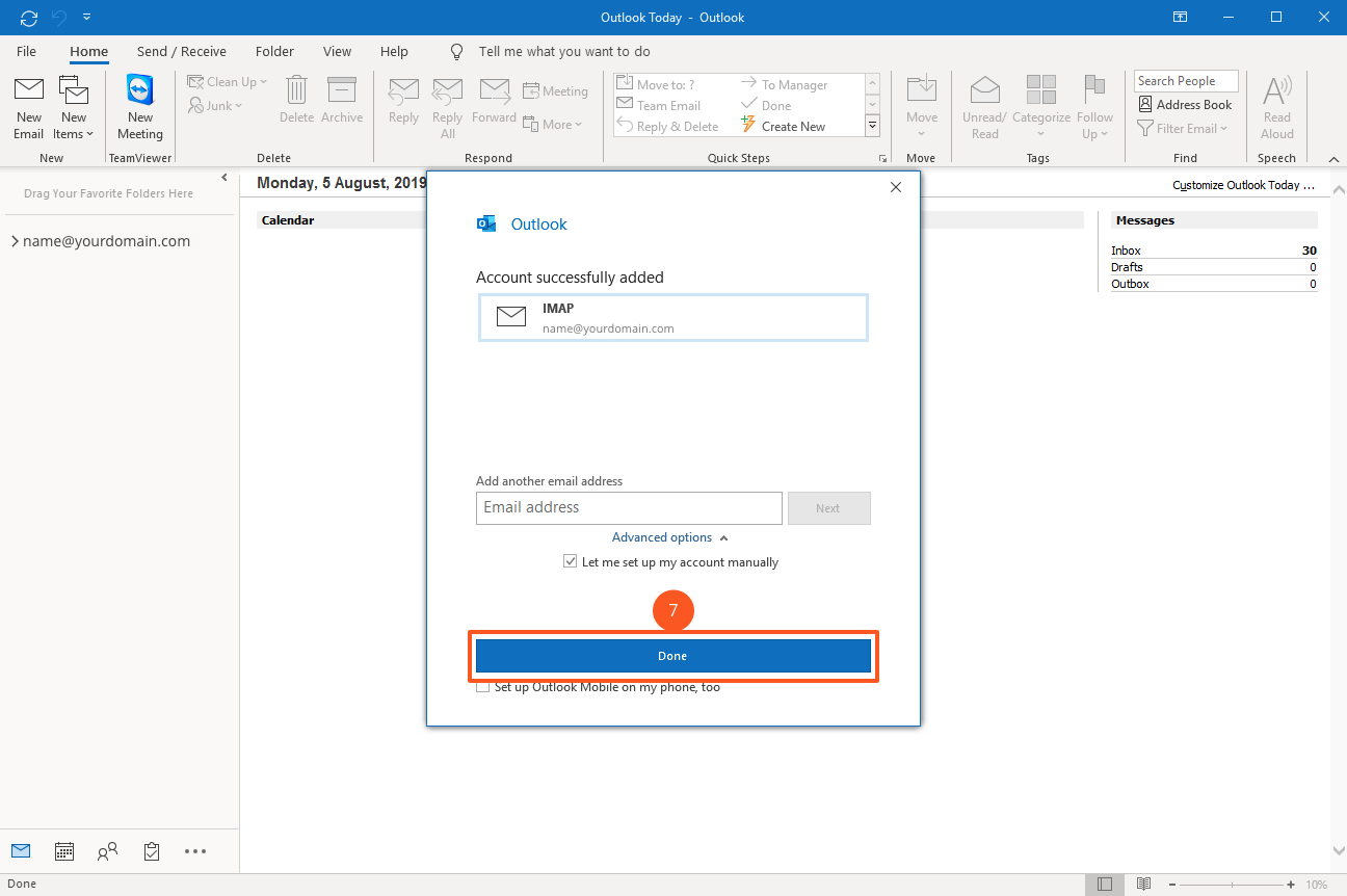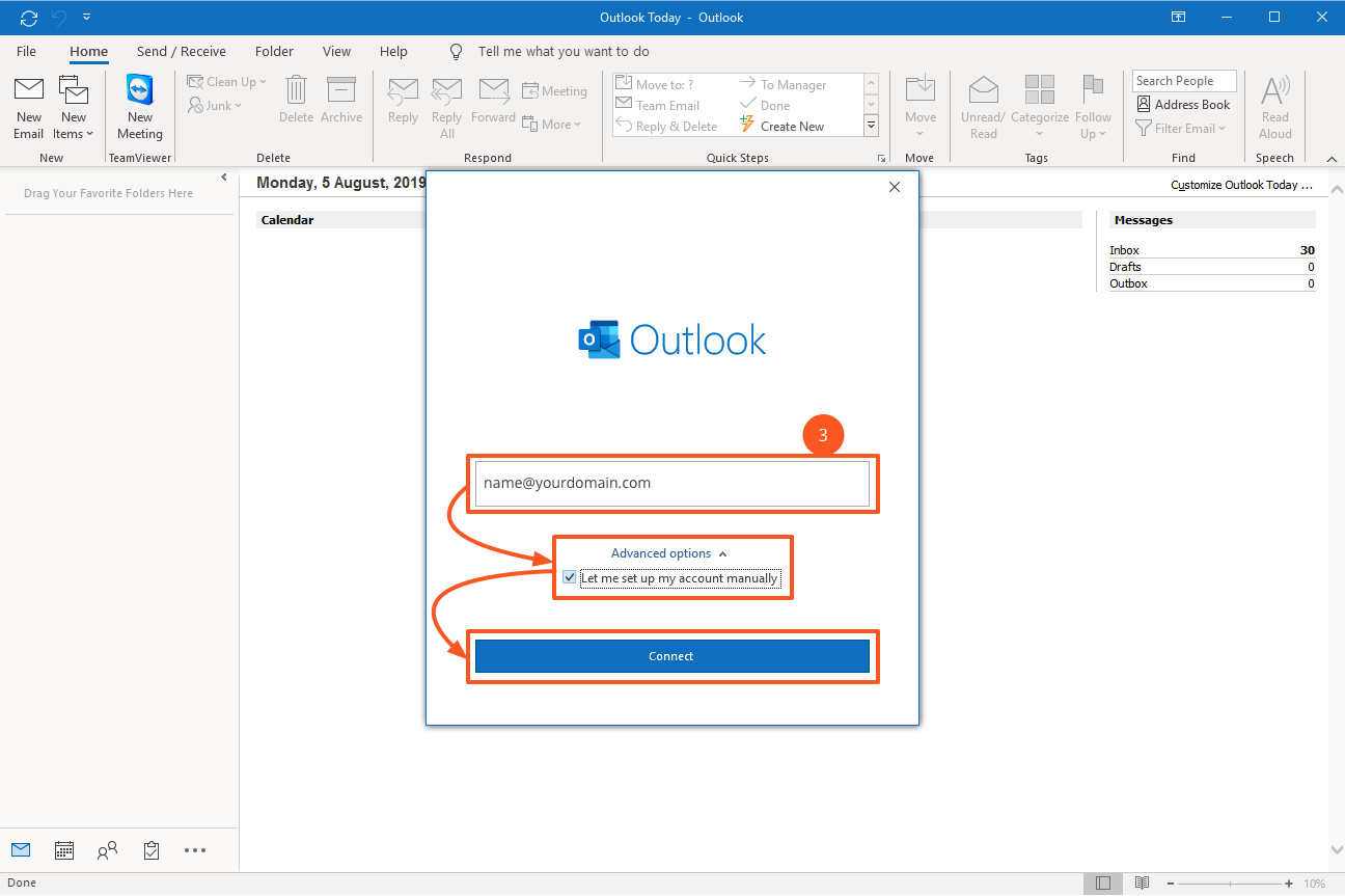 3. A pop-up box like the following image will be shown. Here, enter your email address (e.g. name@yourdomain.com) into the given field, and click on the Advanced options to select “Let me set up my account manually”, and click [Connect].