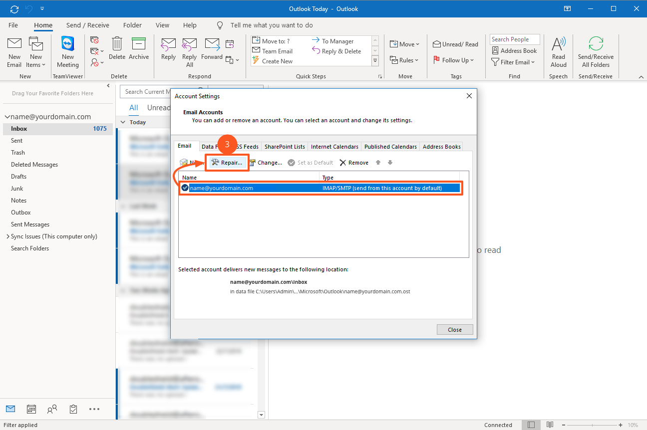 3. A pop-up box entitled “Account Settings” will be displayed. Click on your email account, and select [Repair].