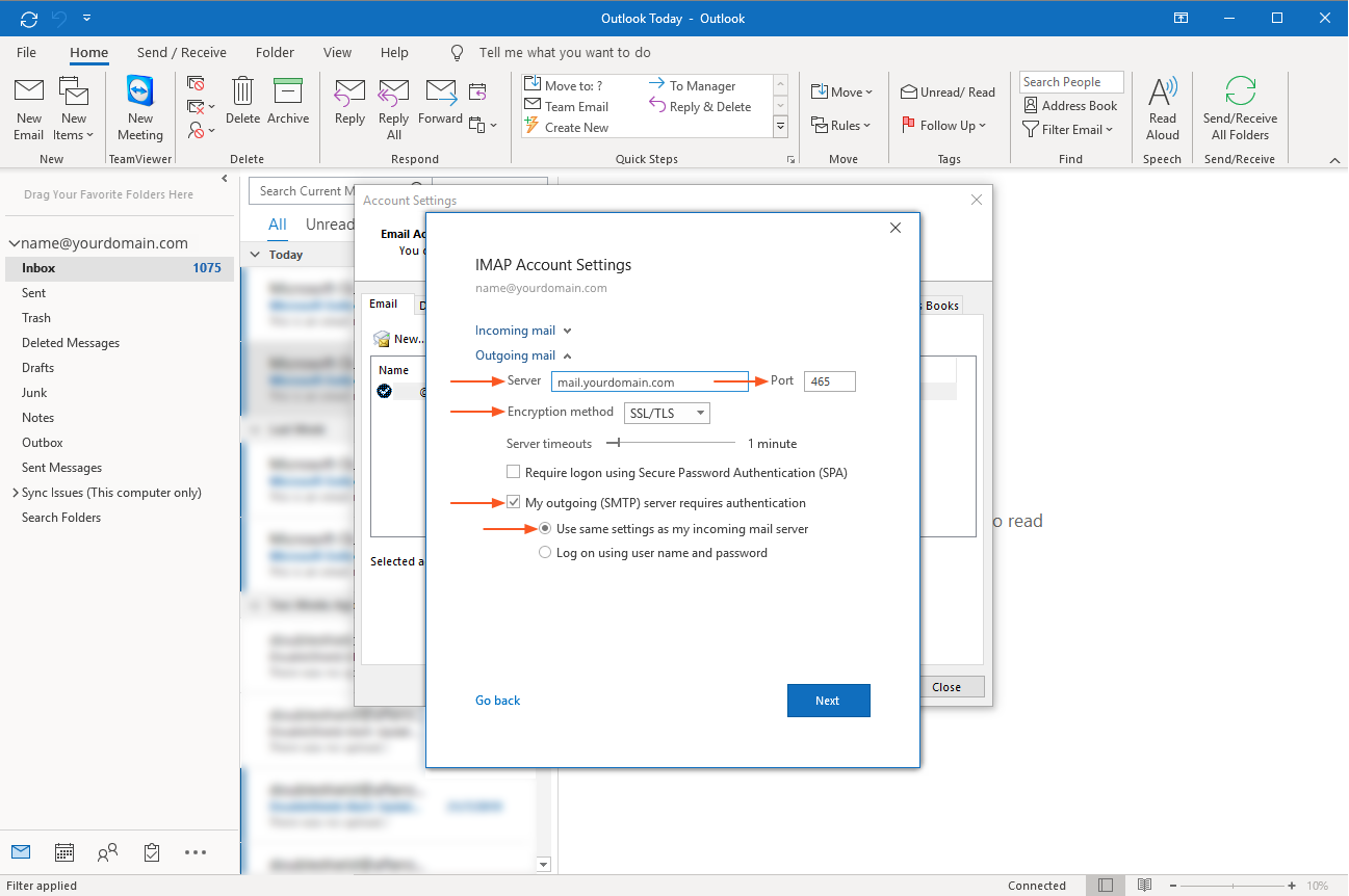 | My outgoing (SMTP) server requires authentication | YES with “Use same settings as my incoming mail server” |