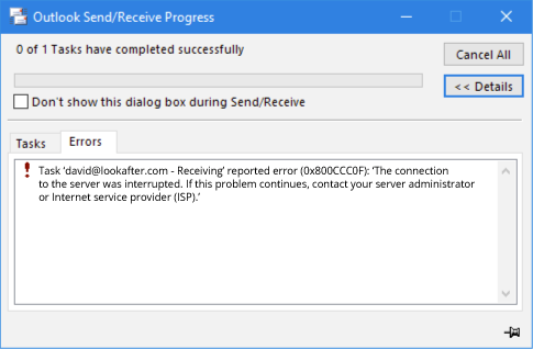 Home > FAQ > Email > Email Clients & Mobile > Mail Client Issues and Troubleshooting > Troubleshooting 0x800CCC0F error on Outlook (POP3)