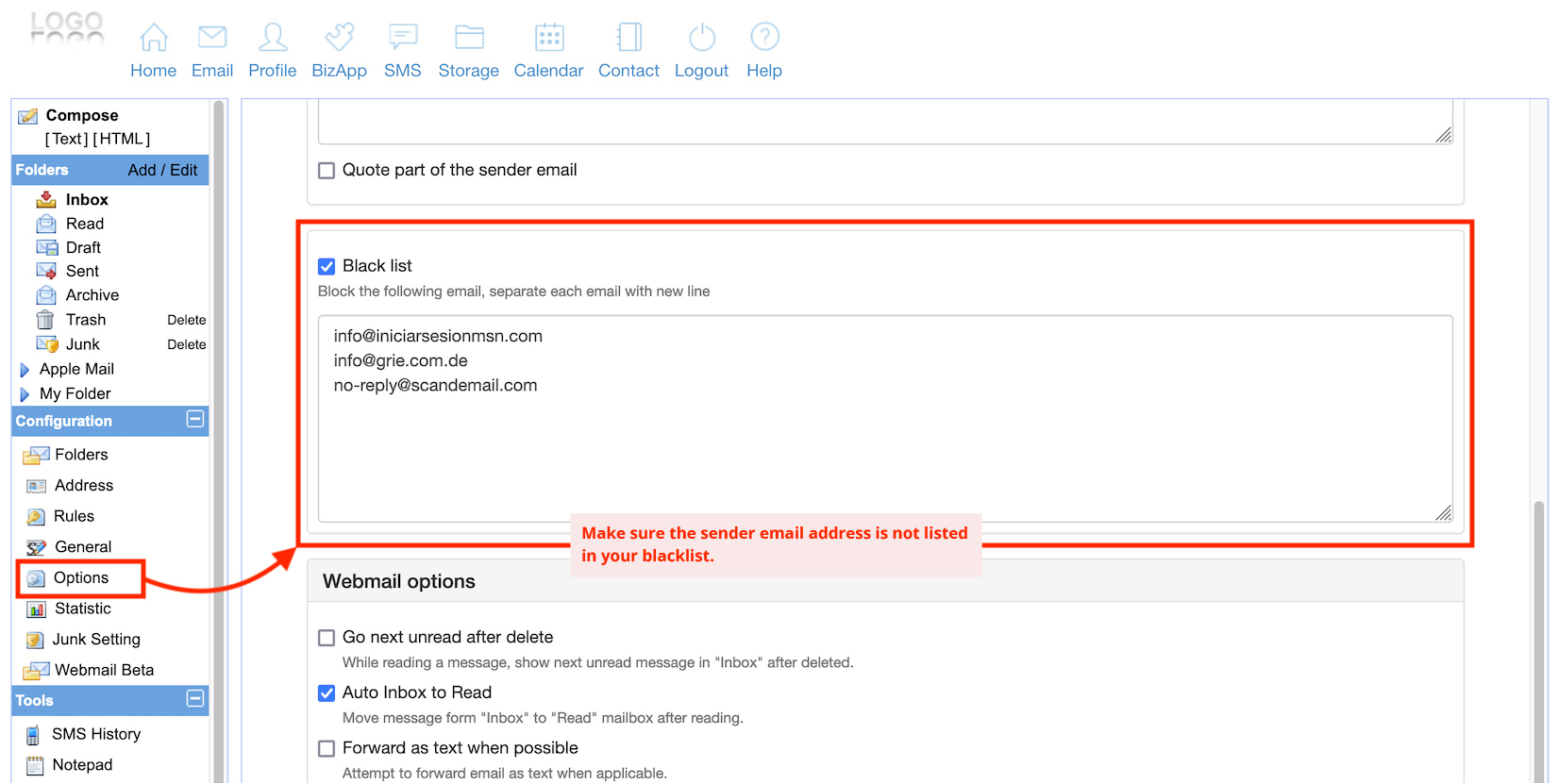 Webmail allows you to block a sender through the blacklist setting. Check if you have mistakenly added the sender to your blacklist, which will blocked all incoming emails coming from that sender. If you found the sender email address in your blacklist, remove it so that you can receive emails from the specific sender.