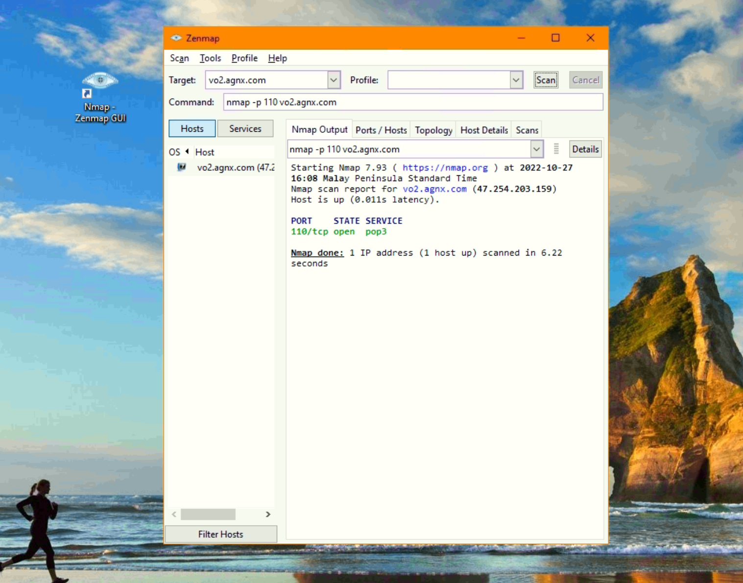 For example, to scan the POP port on vo2.agnx.com, enter nmap -p 110 vo2.agnx.com into the “Command” field and click Scan.