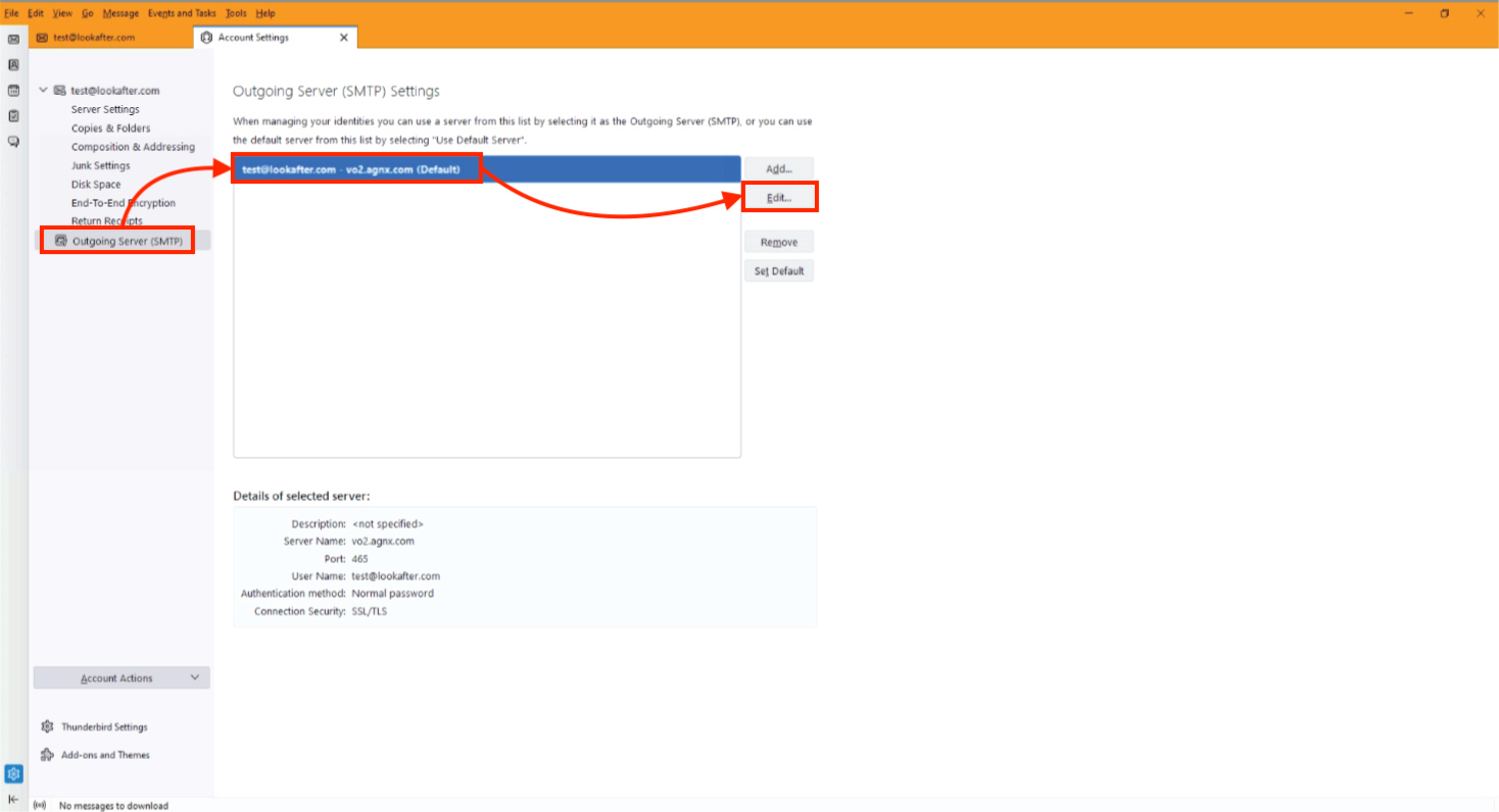 3. To check on the SMTP outgoing server settings, select Outgoing Server (SMTP) from the menu panel. Then, select your outgoing server (it should consists of your email address) and then click Edit.