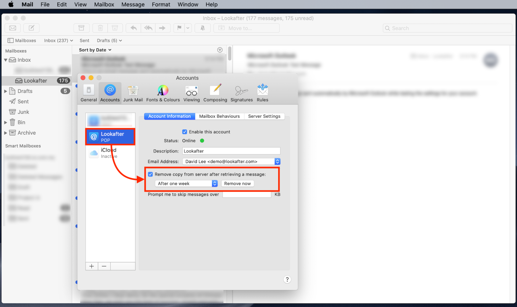 Mac Mail POP3 downloads emails from a server to your PC, and then deletes them from the server after 7 days by default. To change this setting: