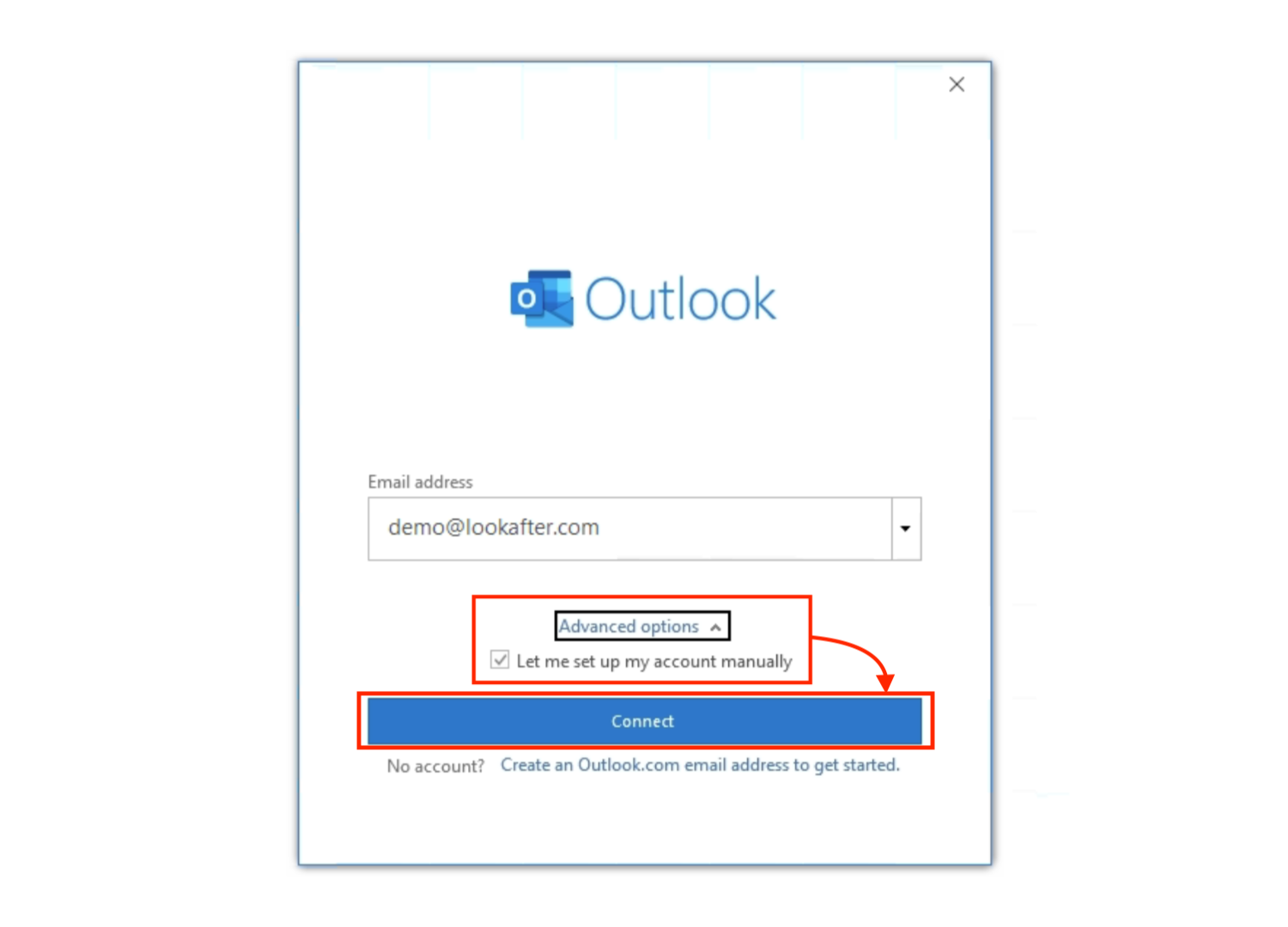 4. Then, click on Advanced options, select Let me set up my account manually and proceed with Connect.