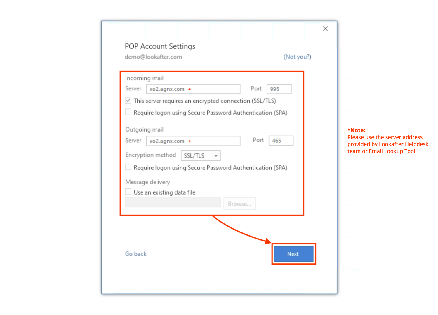 | Incoming mail server | vo1.agnx.com / vo2.agnx.com / g1.agnx.com IMPORTANT: To confirm which server to be used for your domain, please use the Email Lookup Tool or consult Lookafter Helpdesk. |