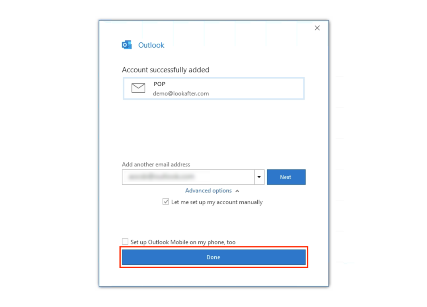8. Once the IMAP account has been successfully added, you will see this screen. Click Done to finish the setup.