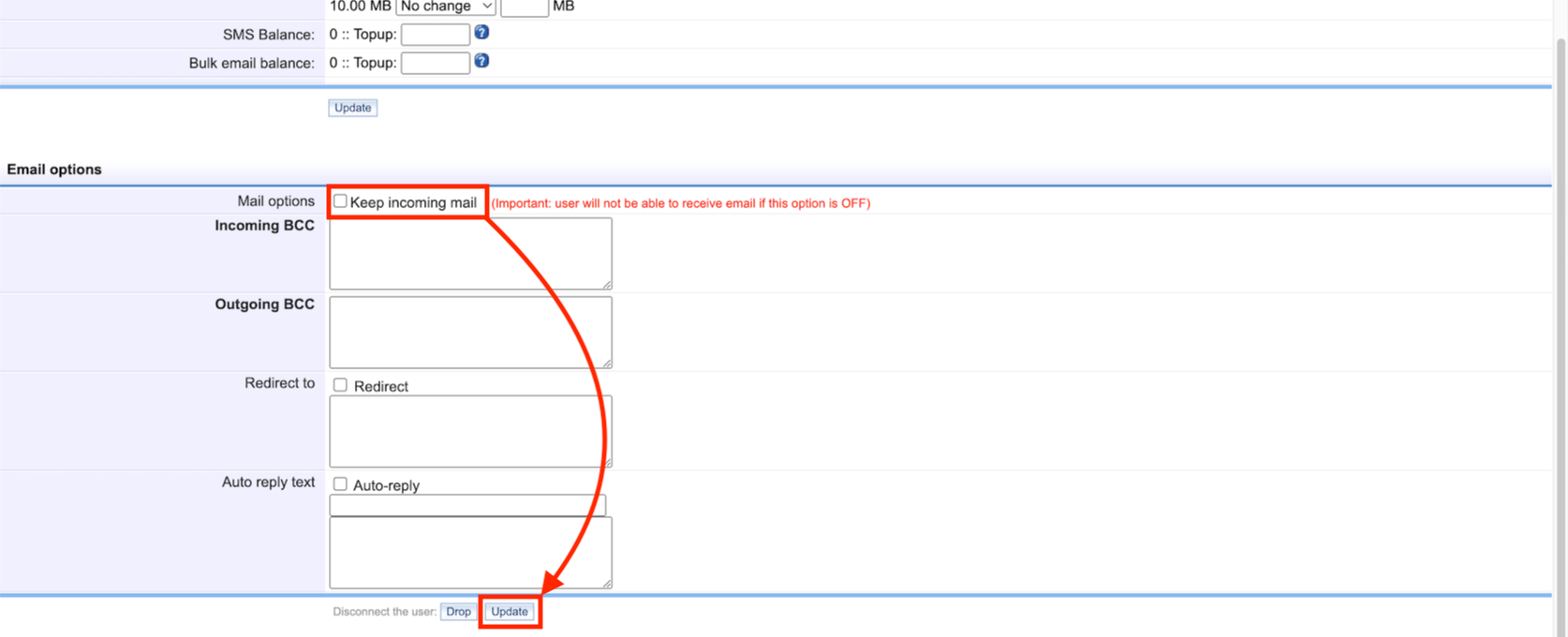 3. Scroll down till the “Email options” section. Uncheck the “Keep incoming mail” checkbox and click Update to save the changes.