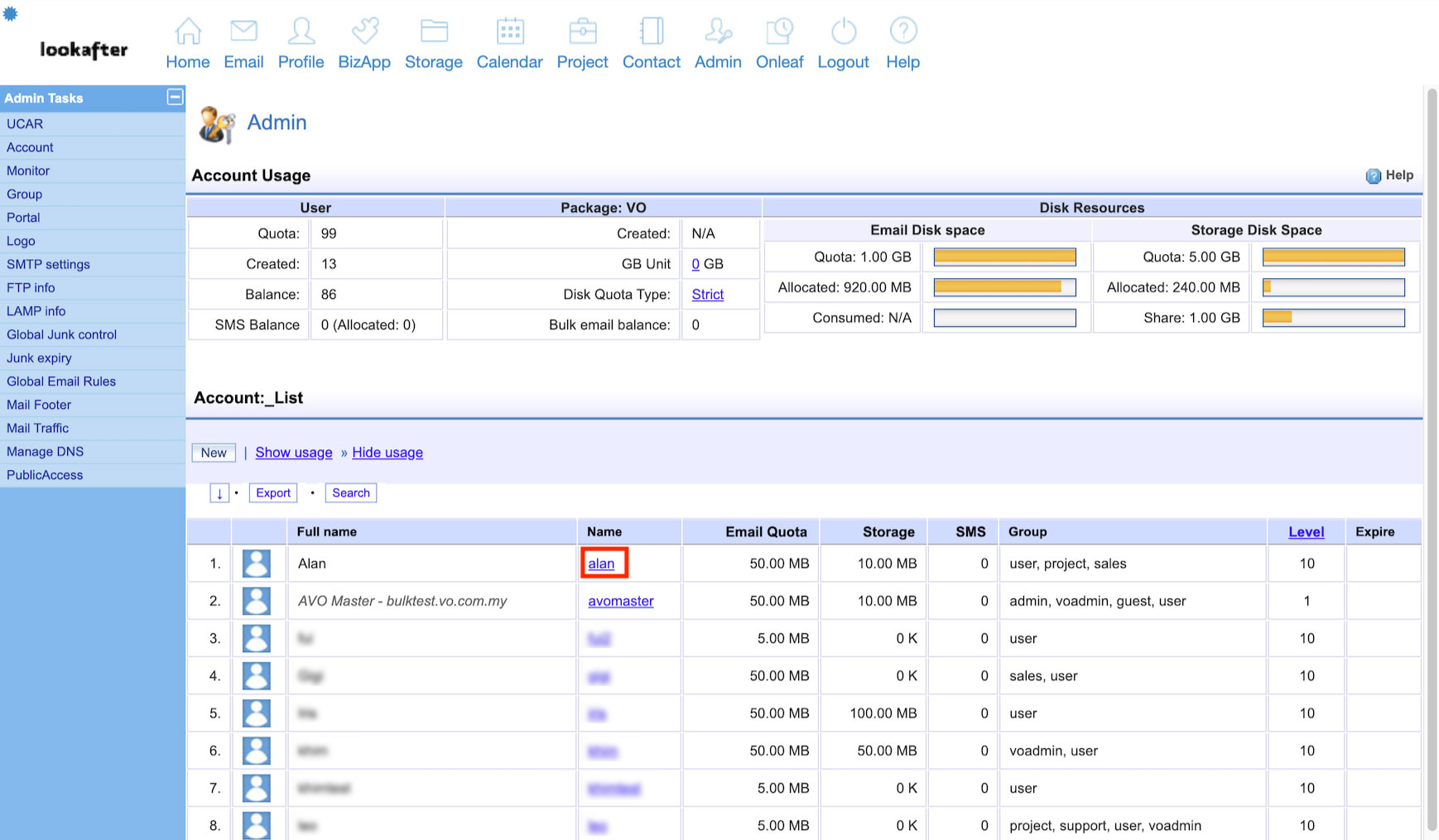 2. Under “Account List”, select the user that you wish to adjust the storage disk space for.