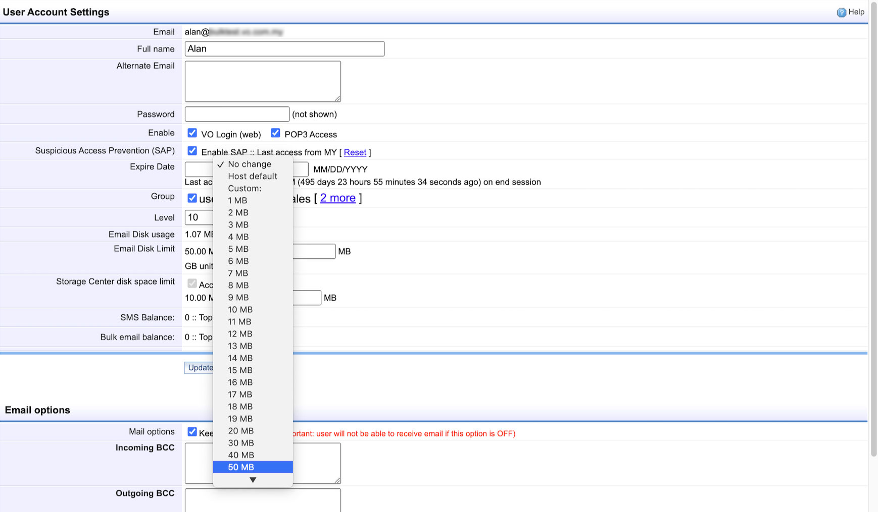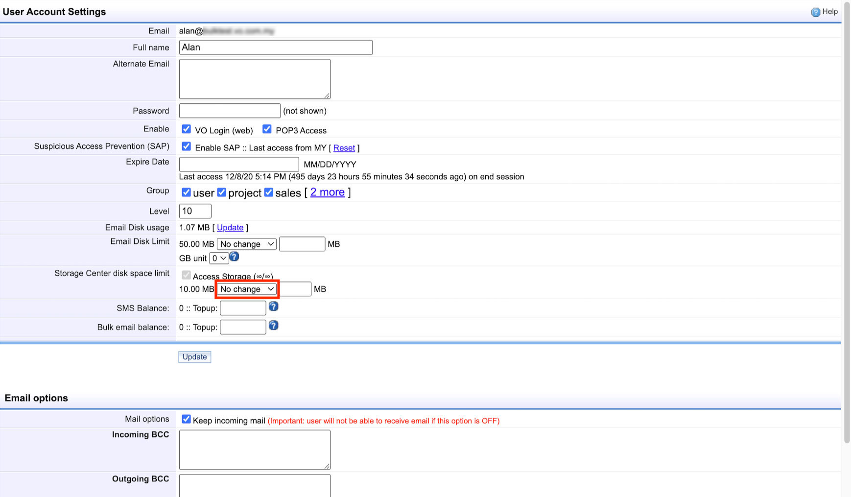 3. At the “User Account Settings”, look for Storage Center Disk Space Limit and click on the “No change” selection box.