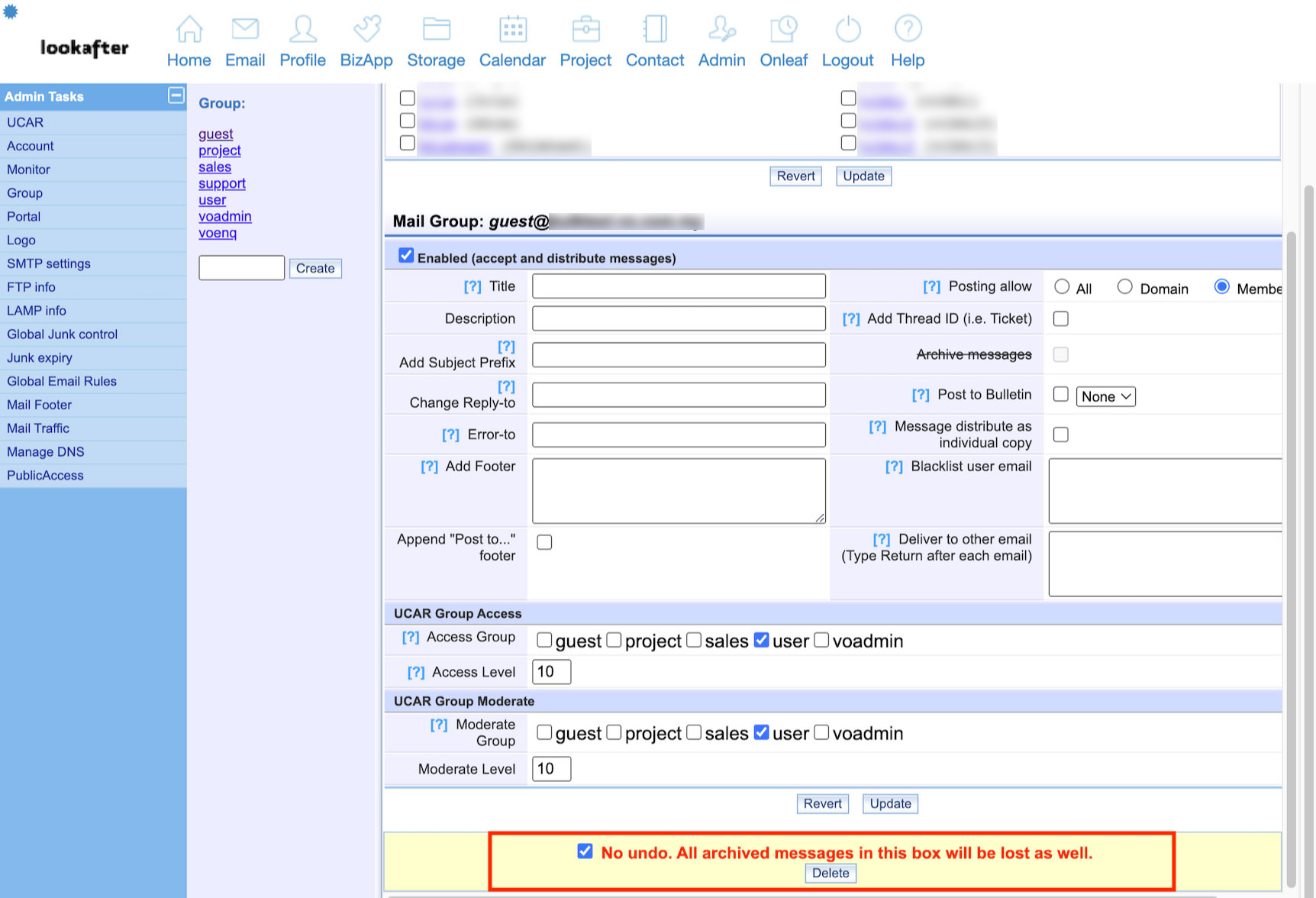 5. Information about the selected group will be displayed. Scroll down till the end where you see a yellow box. Select “No undo. All archive messages in this box will be lost as well” and click Delete.