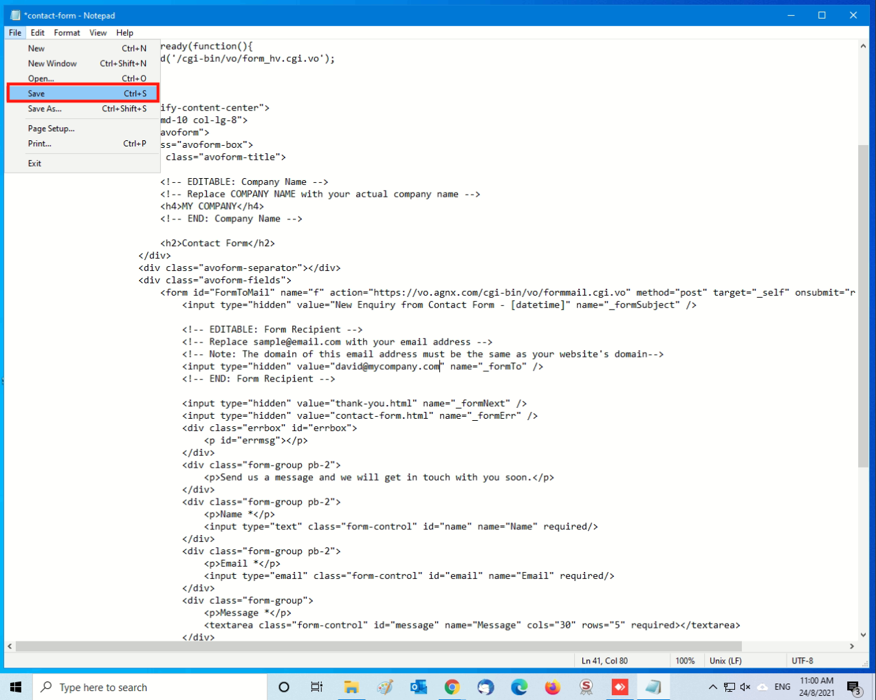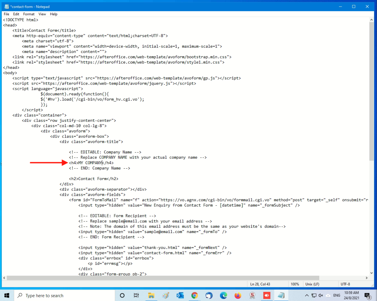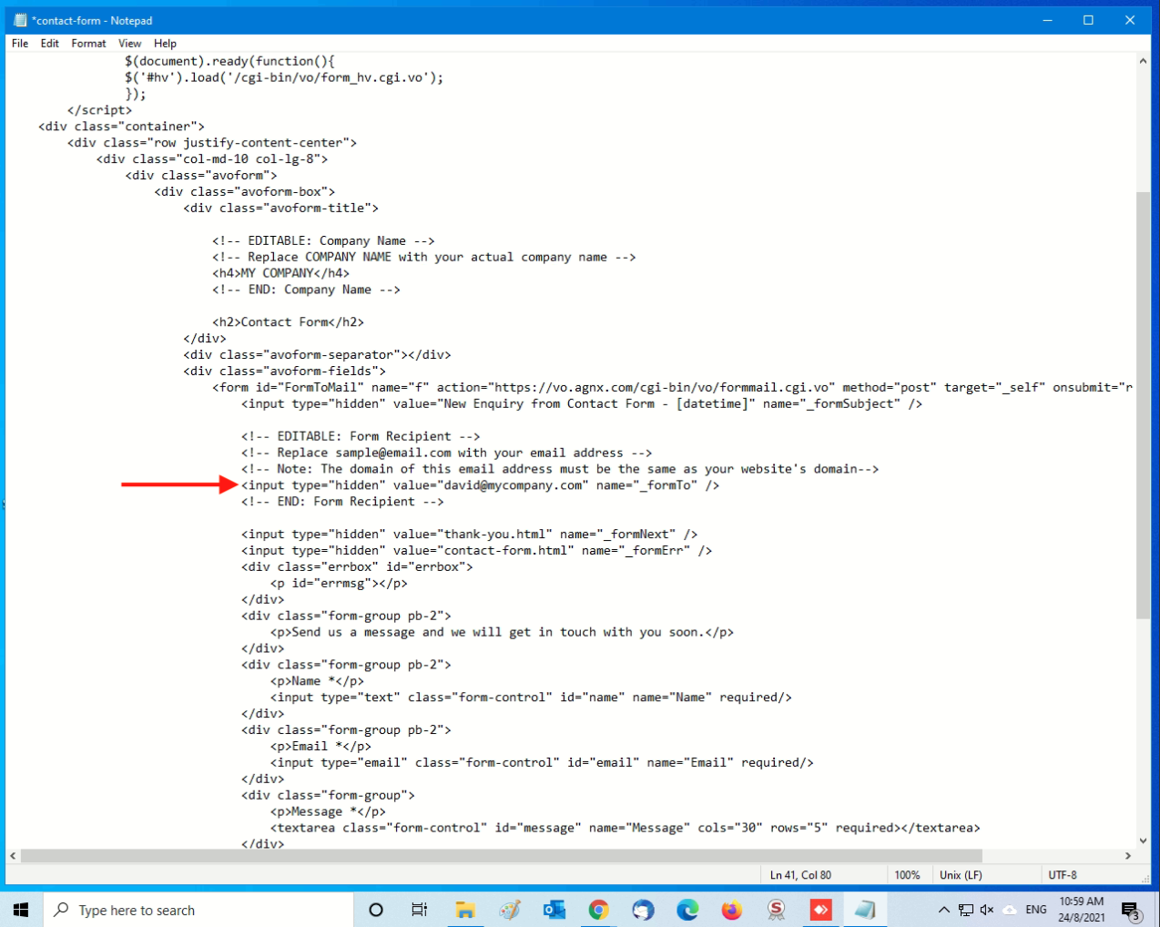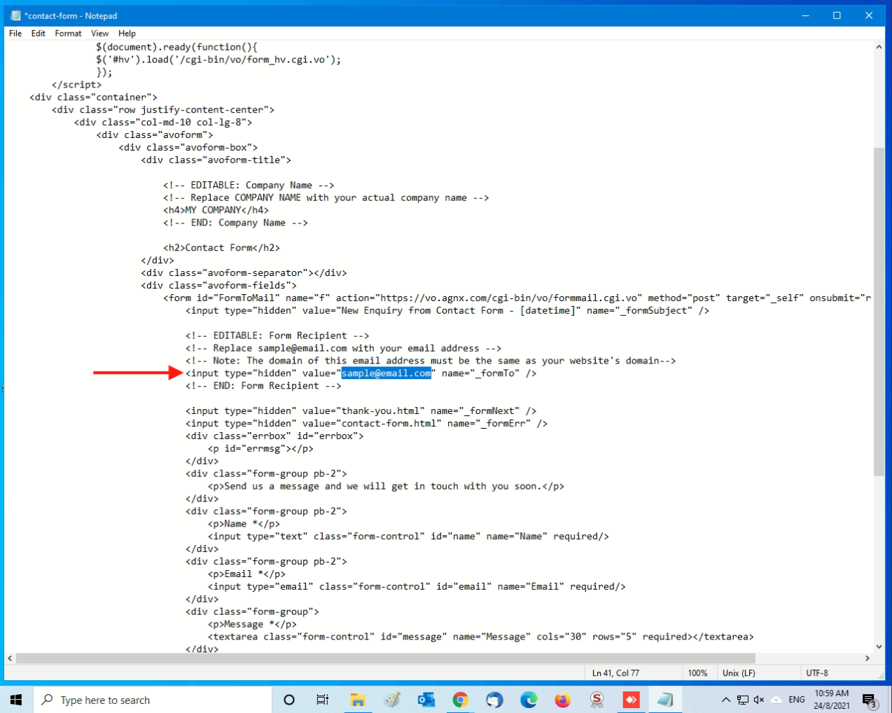Next, we will modify the recipient email address. This recipient email address will be the one who receives all the form submissions. Look for: <!– EDITABLE: Form Recipient –> and you will see <input type=“hidden” value=“sample@email.com” name=“_formTo” /> after a few lines.