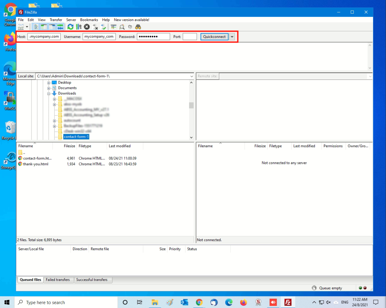 Once you have the above details ready, launch the FTP client on your PC. Enter the host, FTP username and password, and connect.