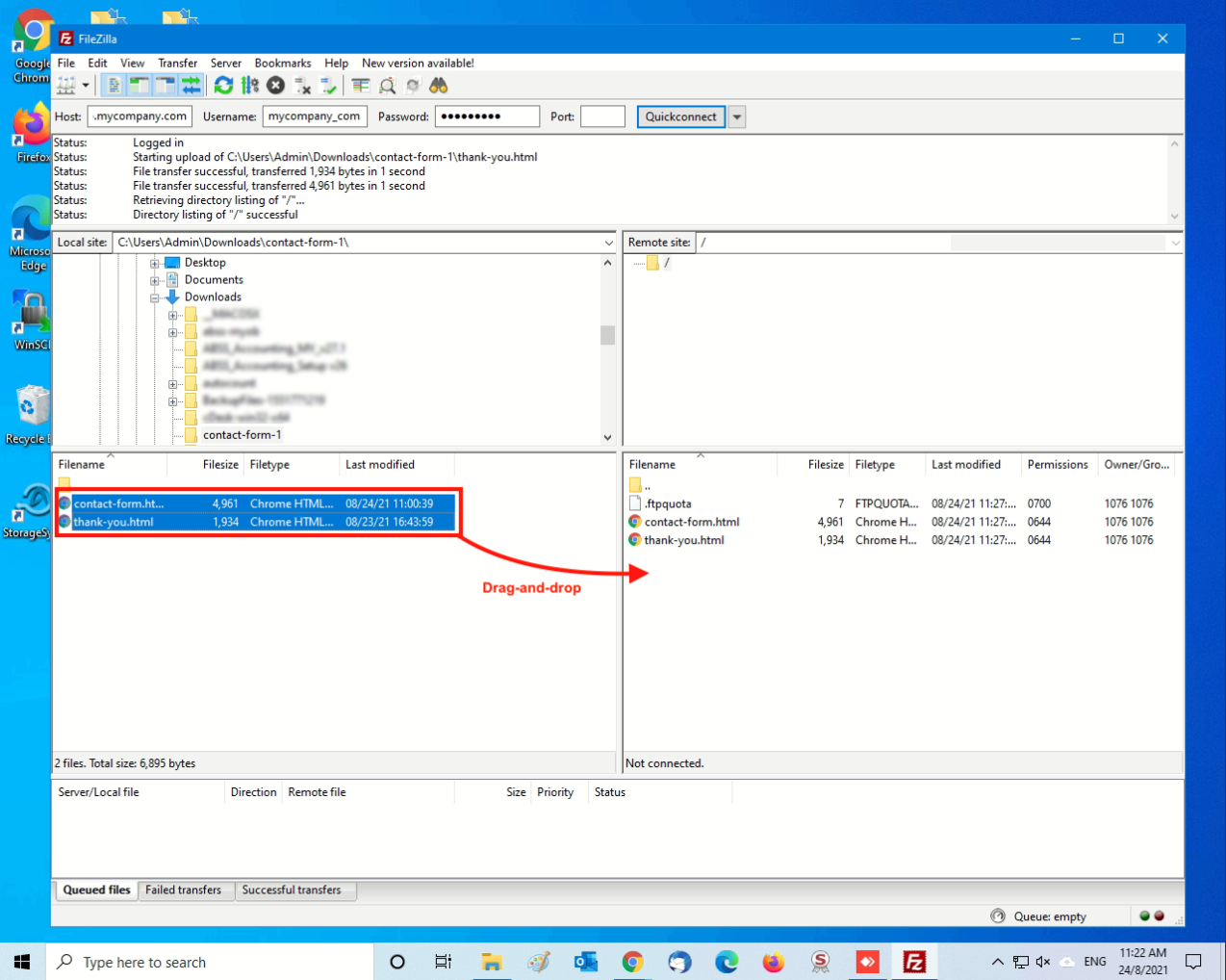 Once you have connected to your web server via FTP, upload the updated contact-form.html. You can simply drag the file and drop it to the remote container.