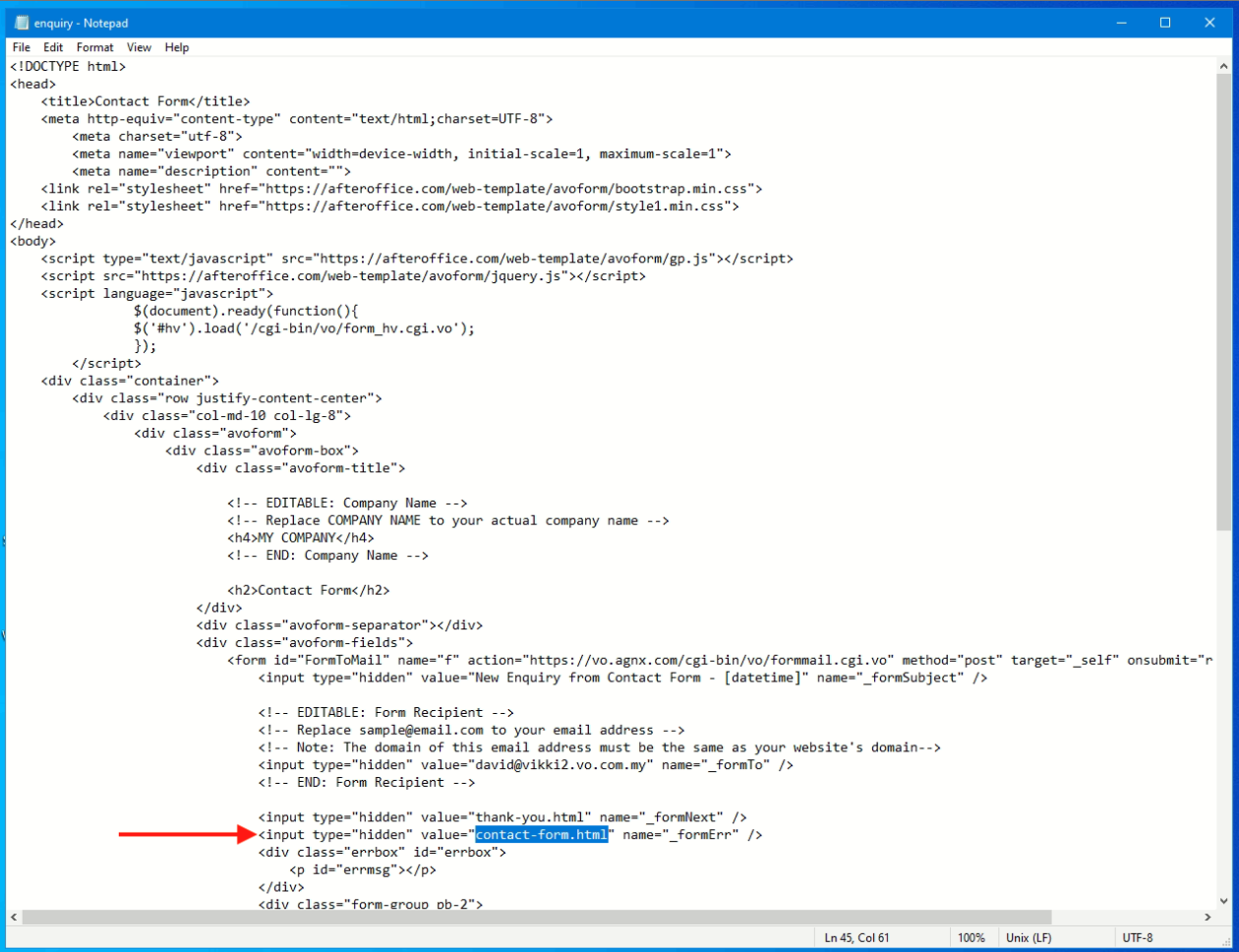Then, open this file with a HTML editor or Notepad. Look for this line: <input type=“hidden” value=“contact-form.html” name=“_formErr” />.