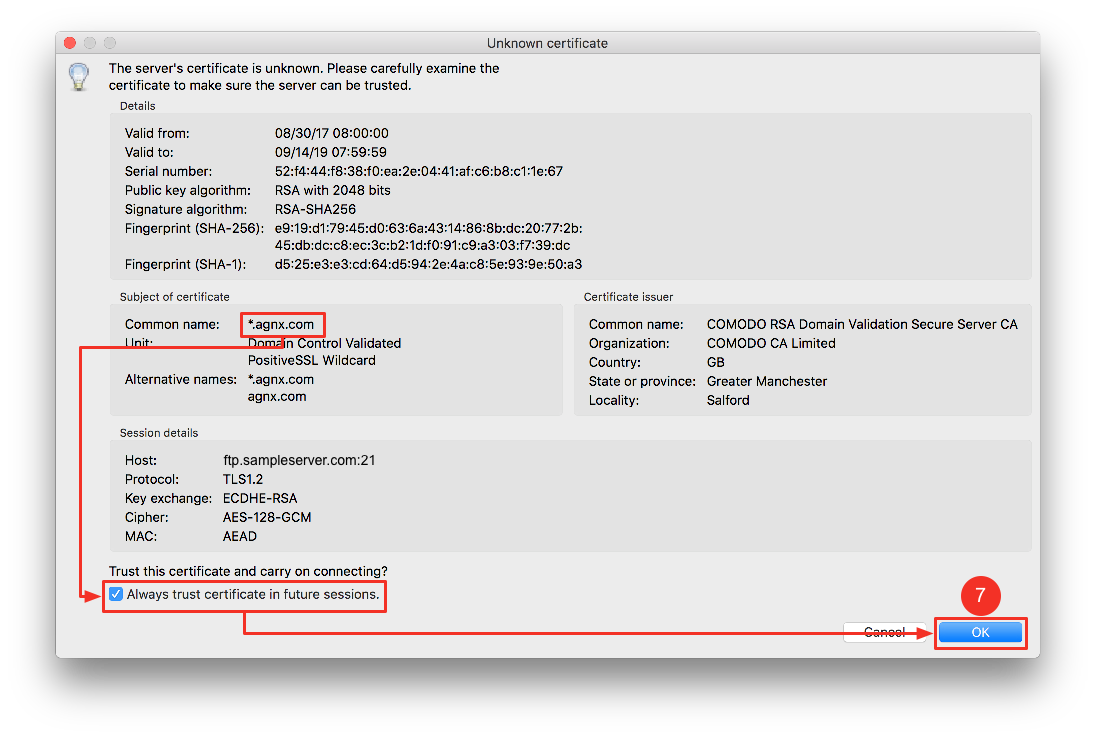 7. You will see a pop-up window showing server’s certificate. Make sure that the certificate name is *.agnx.com. You can select “Always trust certificate in future sessions”, and click [ OK ].