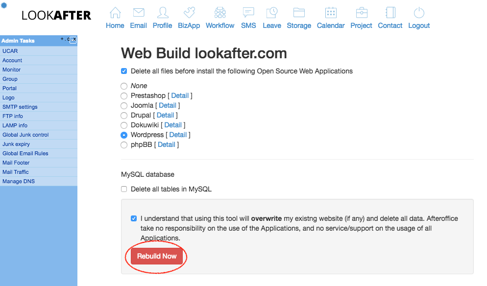 3. Check the “Delete all files before installing the following Open Source Web Applications” checkbox, and select [Wordpress].