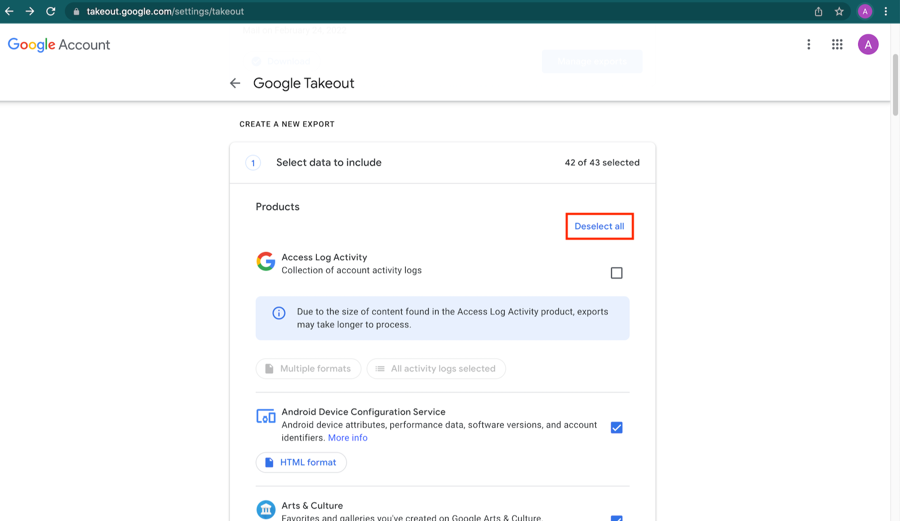 2. By default, all Google products data are selected. Please click on Deselect all to remove all selections.