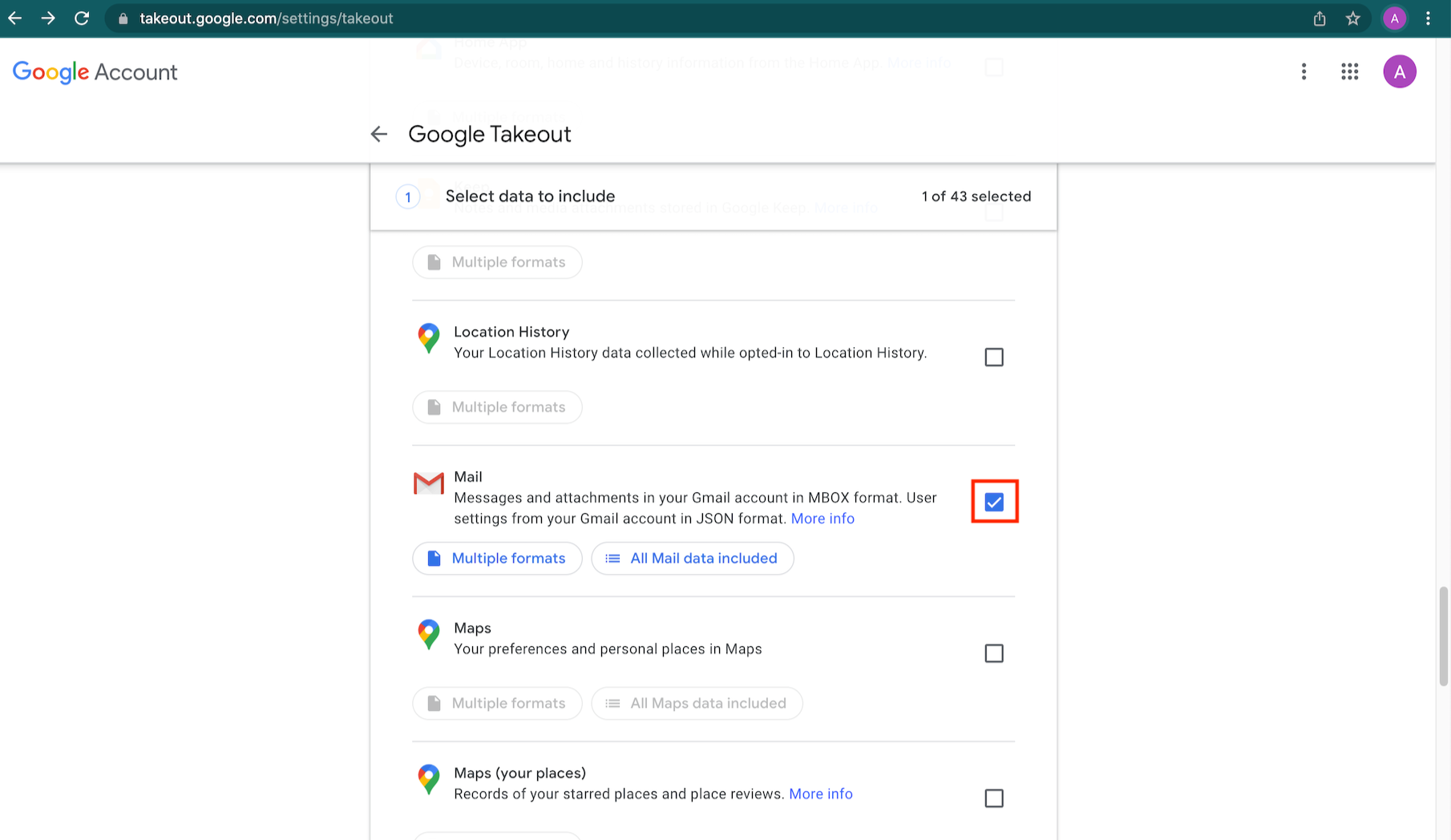 3. Look for Mail in the list, and check it. Make sure “Multiple formats” and “All Mail data included” are selected.
