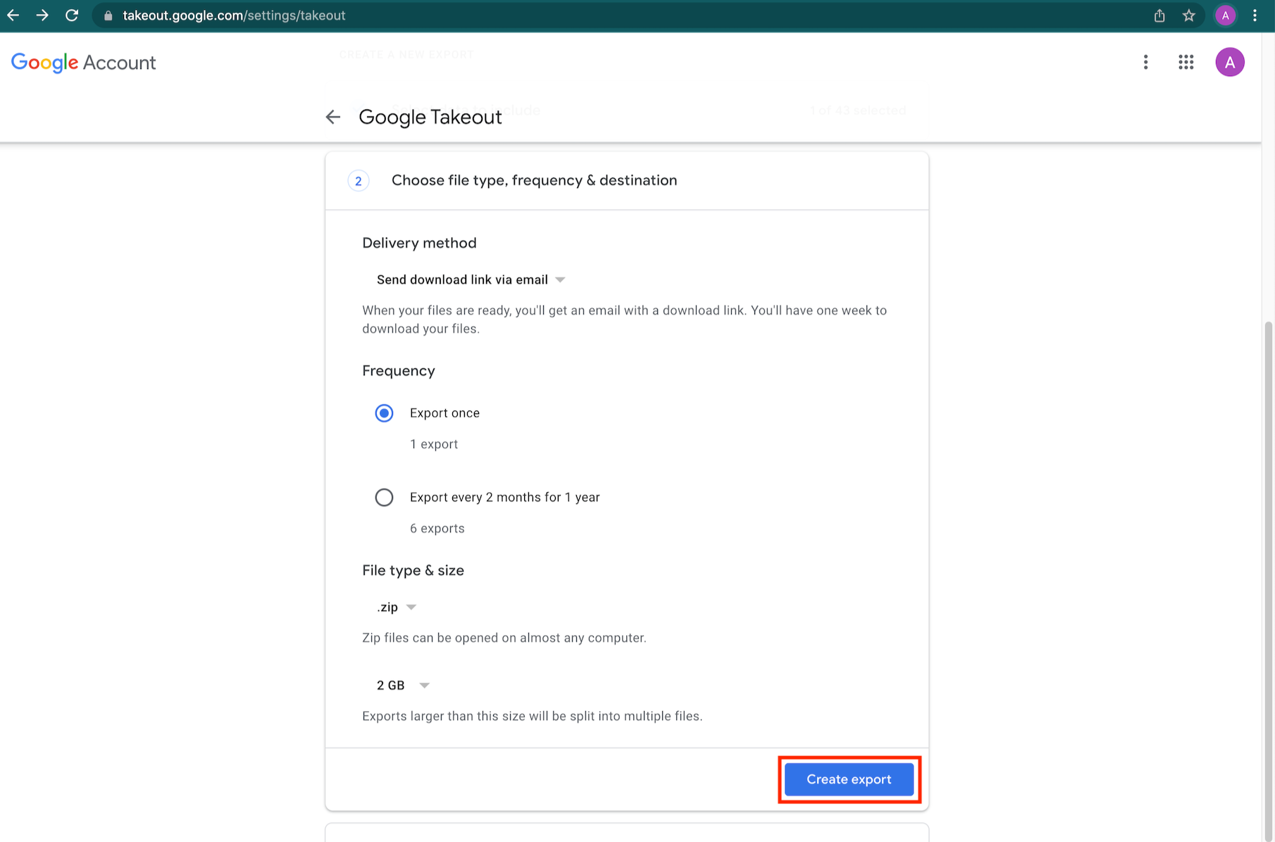 5. You are prompted to choose the file type, frequency and delivery method. All default selections can be maintained (make sure .zip is selected). Click Create export.