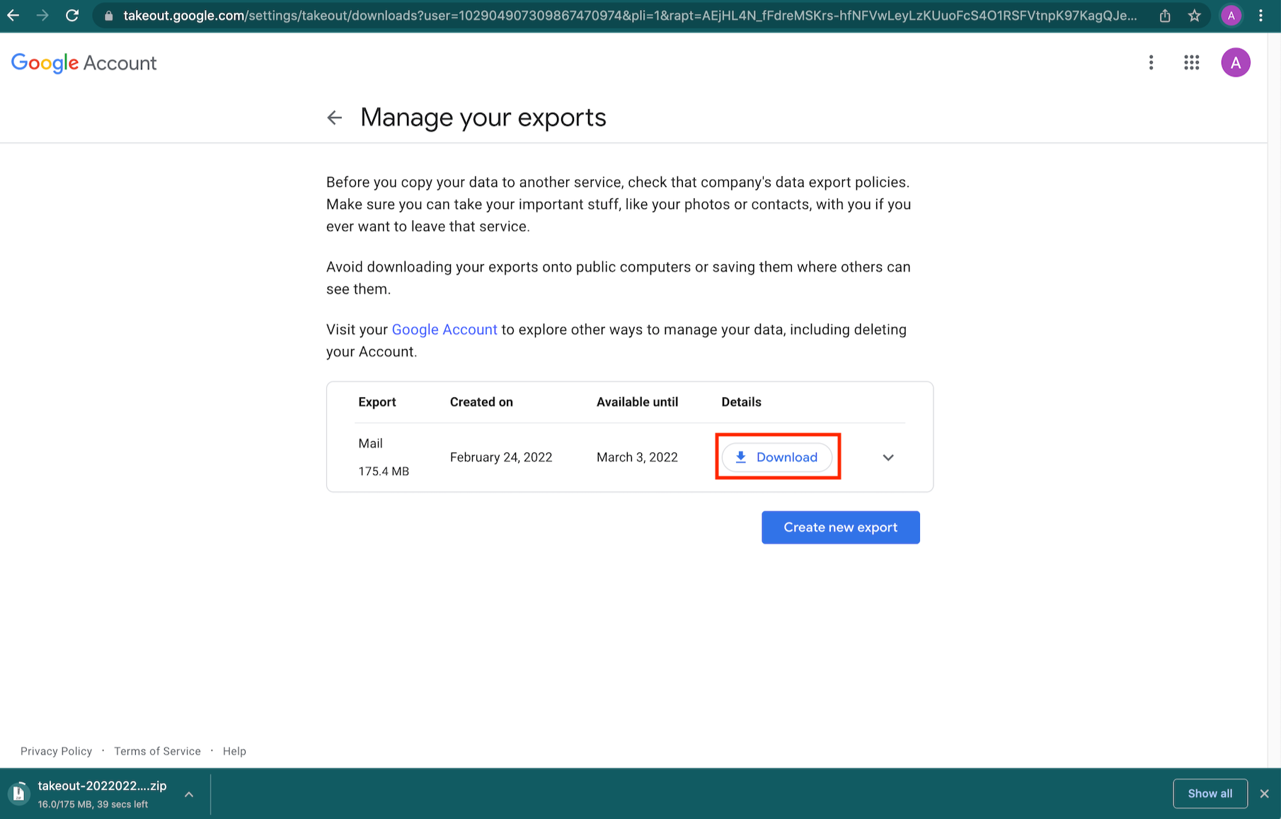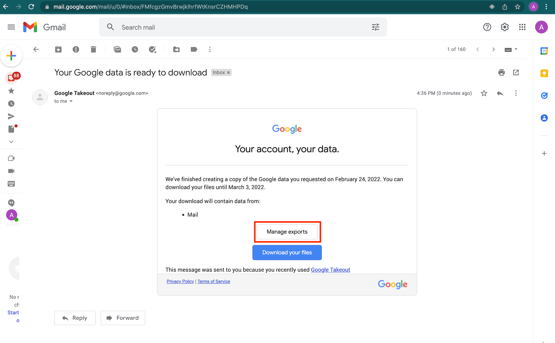 7. You will receive an email from Google once your email data is ready to download. Click Manage exports to view all available email exports.