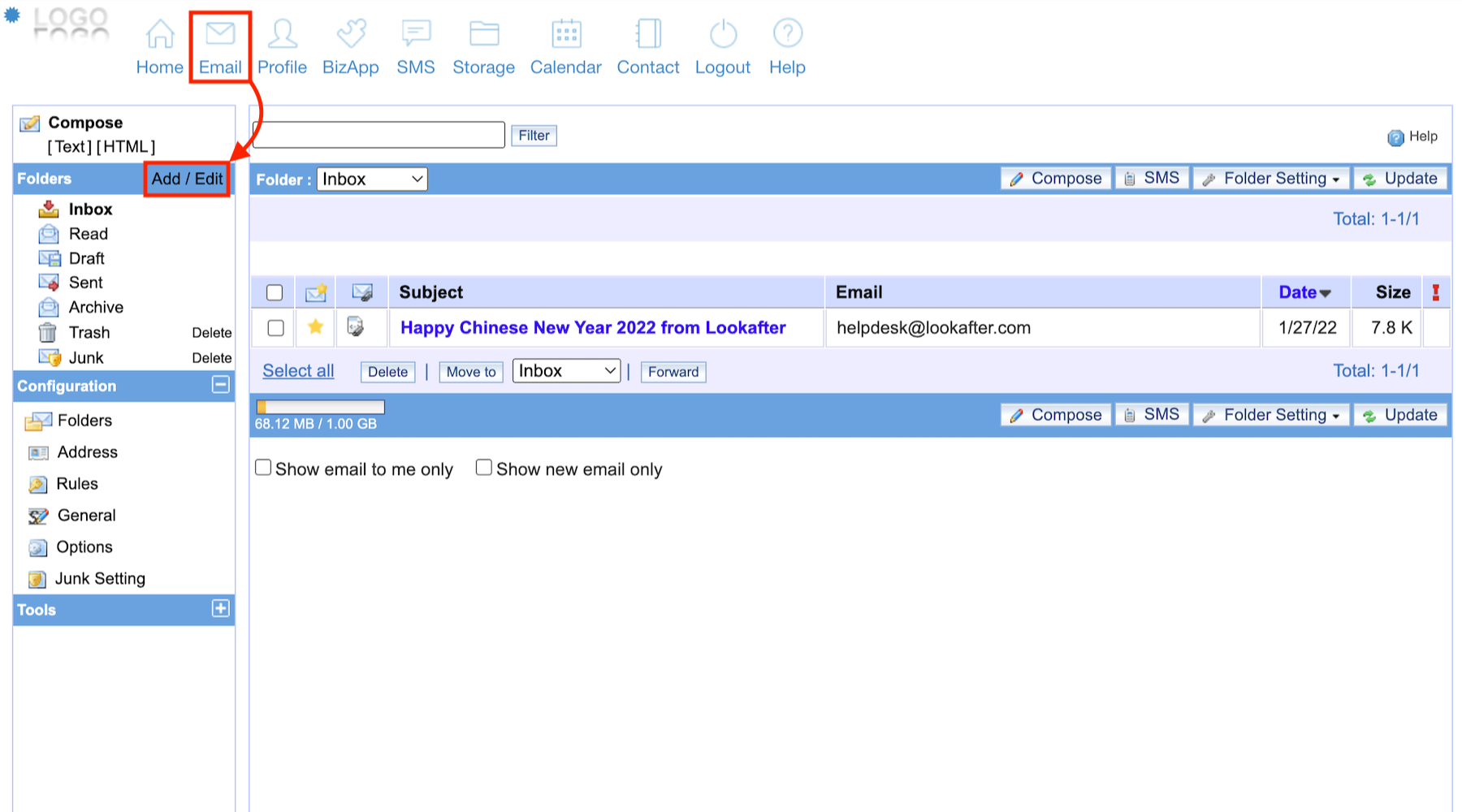 1. Go to Email. Click on the Add / Edit link next to Folders.