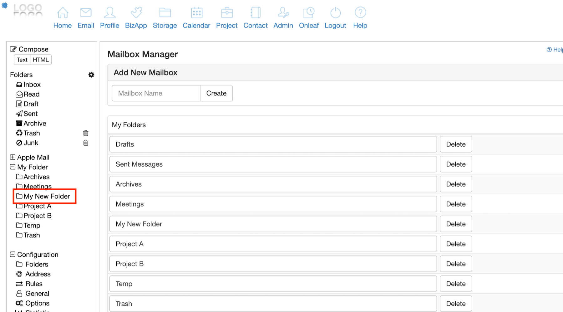 2. On Add New Mailbox, key in the folder name of your choice and click Create.