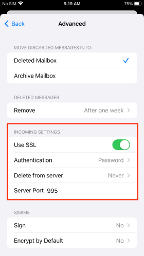 7. Go back to the previous page, and click Advanced to check on the advanced settings of your incoming mail server.