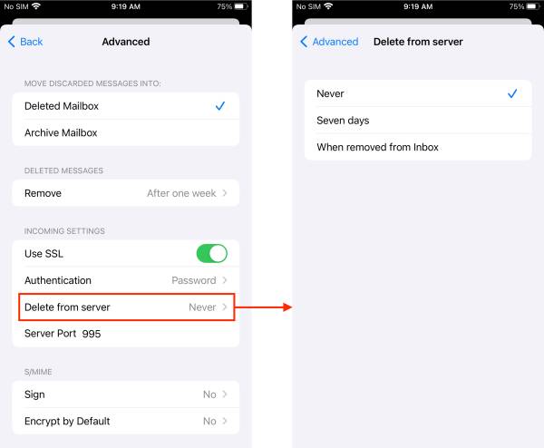 4. Click Delete from server. Here, you can choose to keep emails in the server for “Seven days”. Optionally, if you want to delete the email when it is deleted from your iPhone, choose “When removed from Inbox”.