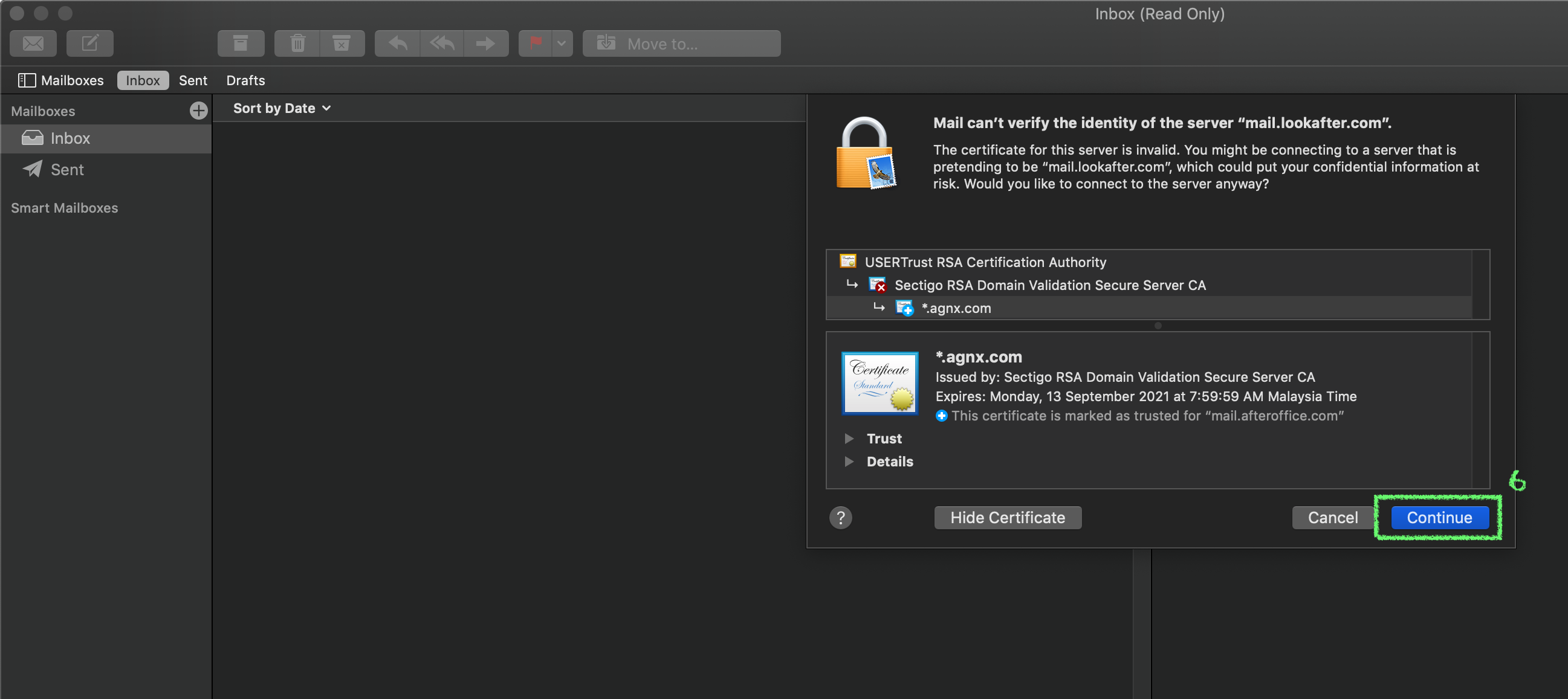 *Note: As AfterOffice is using agnx.com as the Global Network Exchange domain, the system is unable to match your mail server (mail.yourdomain.com) with agnx.com, thus, it shows the above warning. You can safely accept this certificate as it is our valid certificate, used for establishing secure connection between your mail client and the server.