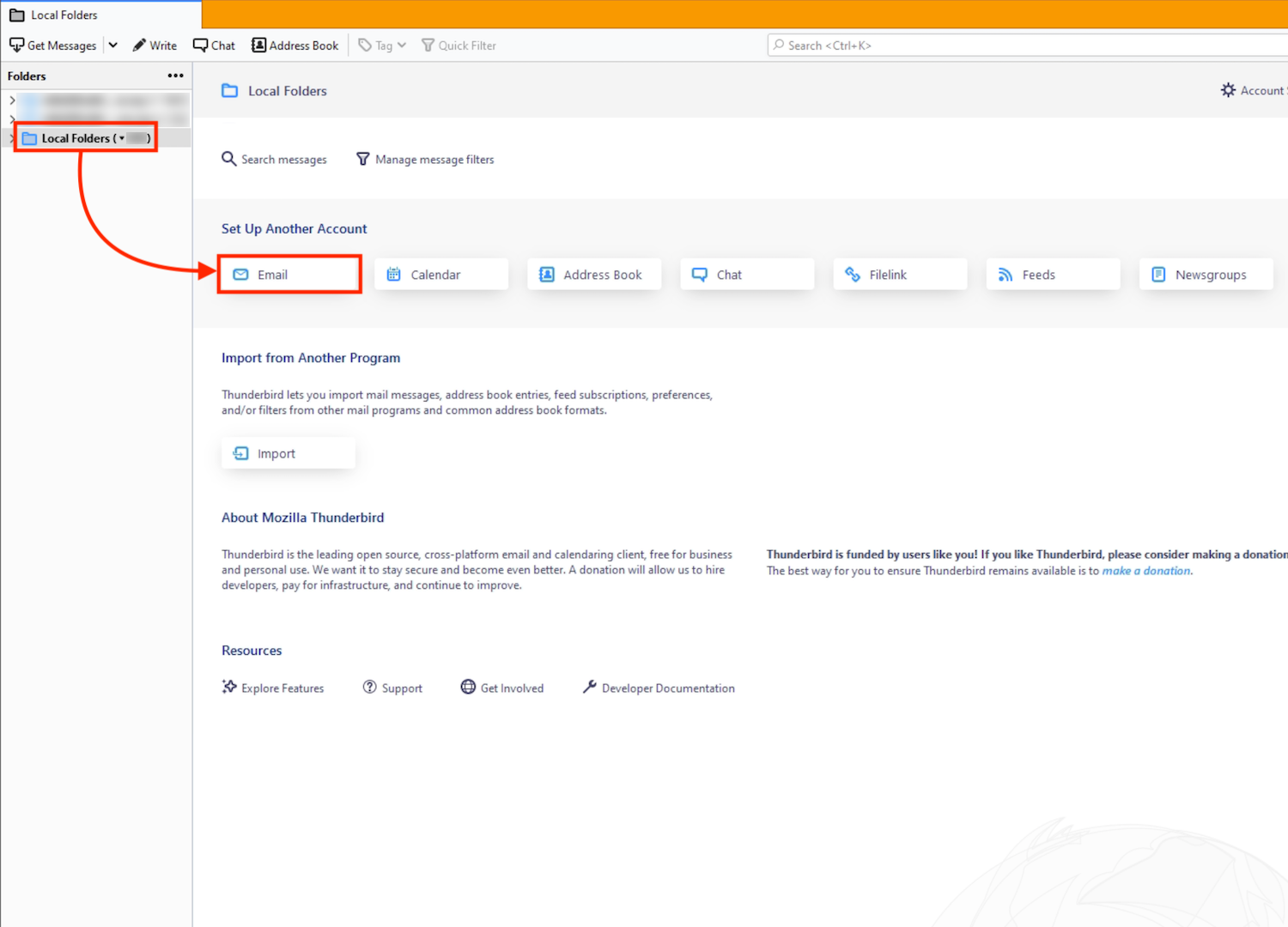 1. Open Mozilla Thunderbird and click on Local Folders. Under “Set Up Another Account”, click Email.