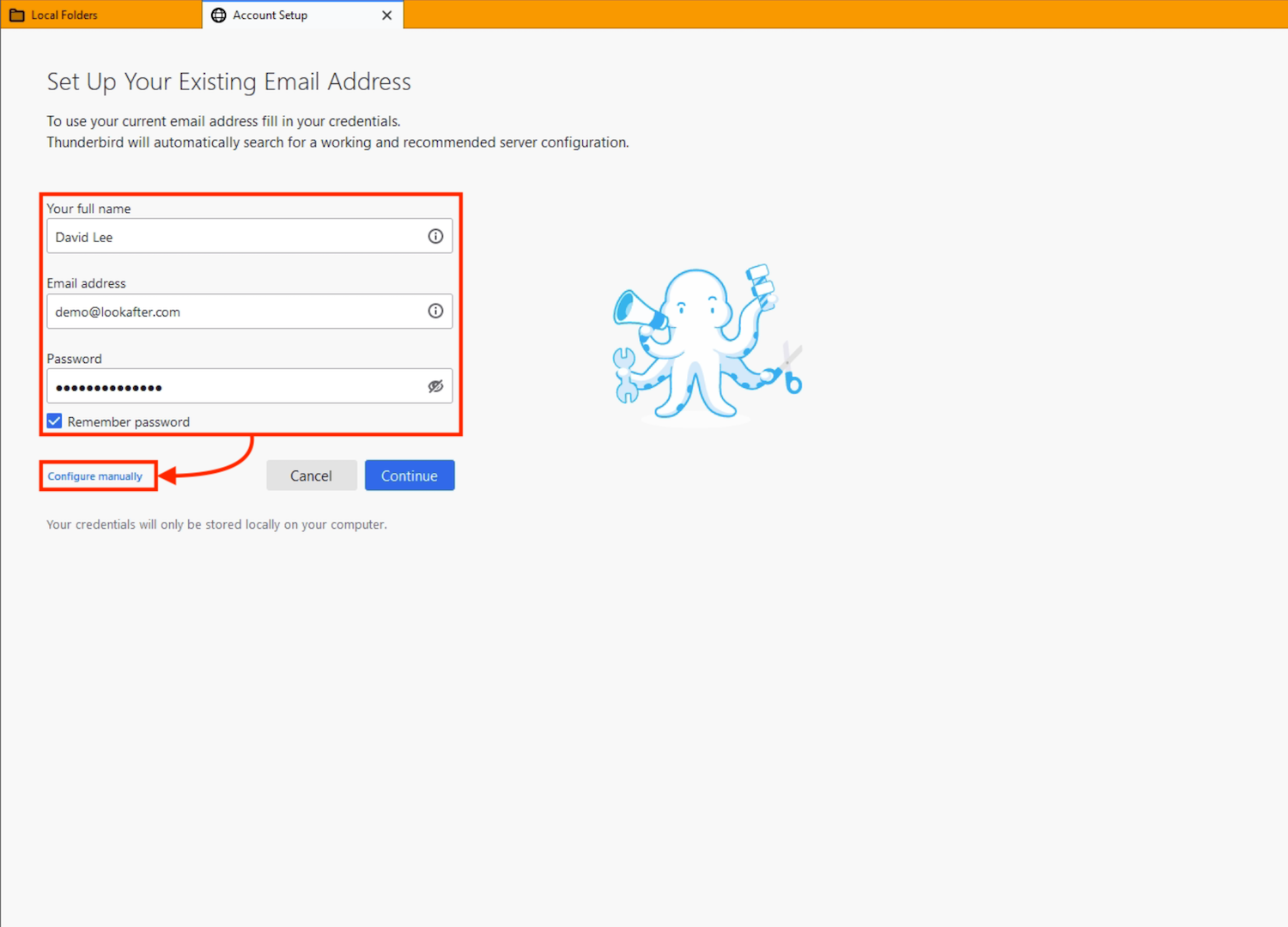 2. A new tab with the title “Set Up Your Existing Email Address” will be opened. Here, fill in your name, email address and password. Make sure the “Remember password” option is selected. Then, click Configure manually.
