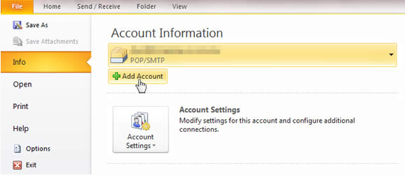 Note: If you are not running MS Outlook 2010 for the first time, go to “File” “Info” and choose “Add Account”.
