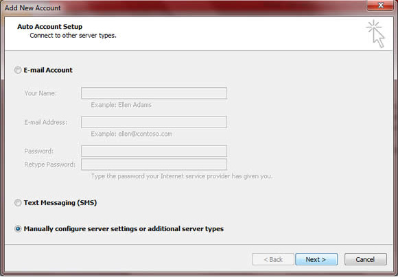3. Select “Manually configure server settings or additional server types” and then click “Next”.