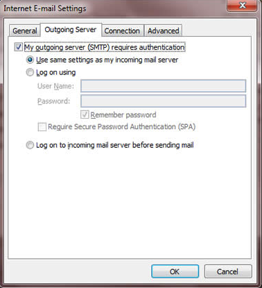 7. On “Outgoing Server” tab, tick the option “My outgoing server (SMTP) requires authentication” and select “Use same settings as my incoming mail server”.