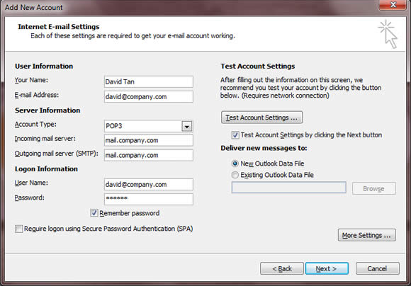 -Enable the “Test Account Settings by clicking the Next button” if you want to test your configuration after completing the setup.